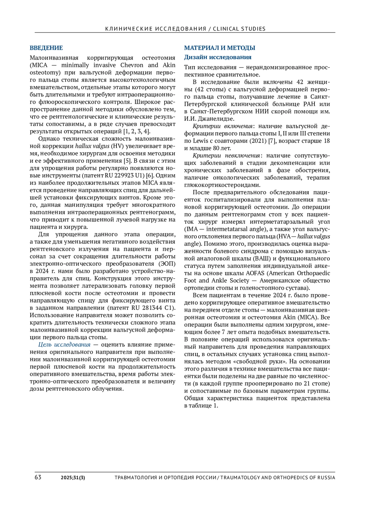 Материал и методы. В исследовании приняли участие 42 пациента с hallux valgus, разделенные на две группы. Все пациенты были прооперированы с использованием малоинвазивной хирургической техники. В группу «Направитель» вошел 21 пациент (21 стопа), которым была выполнена остеотомия с применением оригинального направителя. Пациентам группы «Свободная рука» (21 пациент, 21 стопа) остеотомия выполнялась без использования направителя. После завершения операции регистрировали ее длительность, а также дозу рентгеновского излучения, измеренную с помощью датчиков электронно-оптического преобразователя.