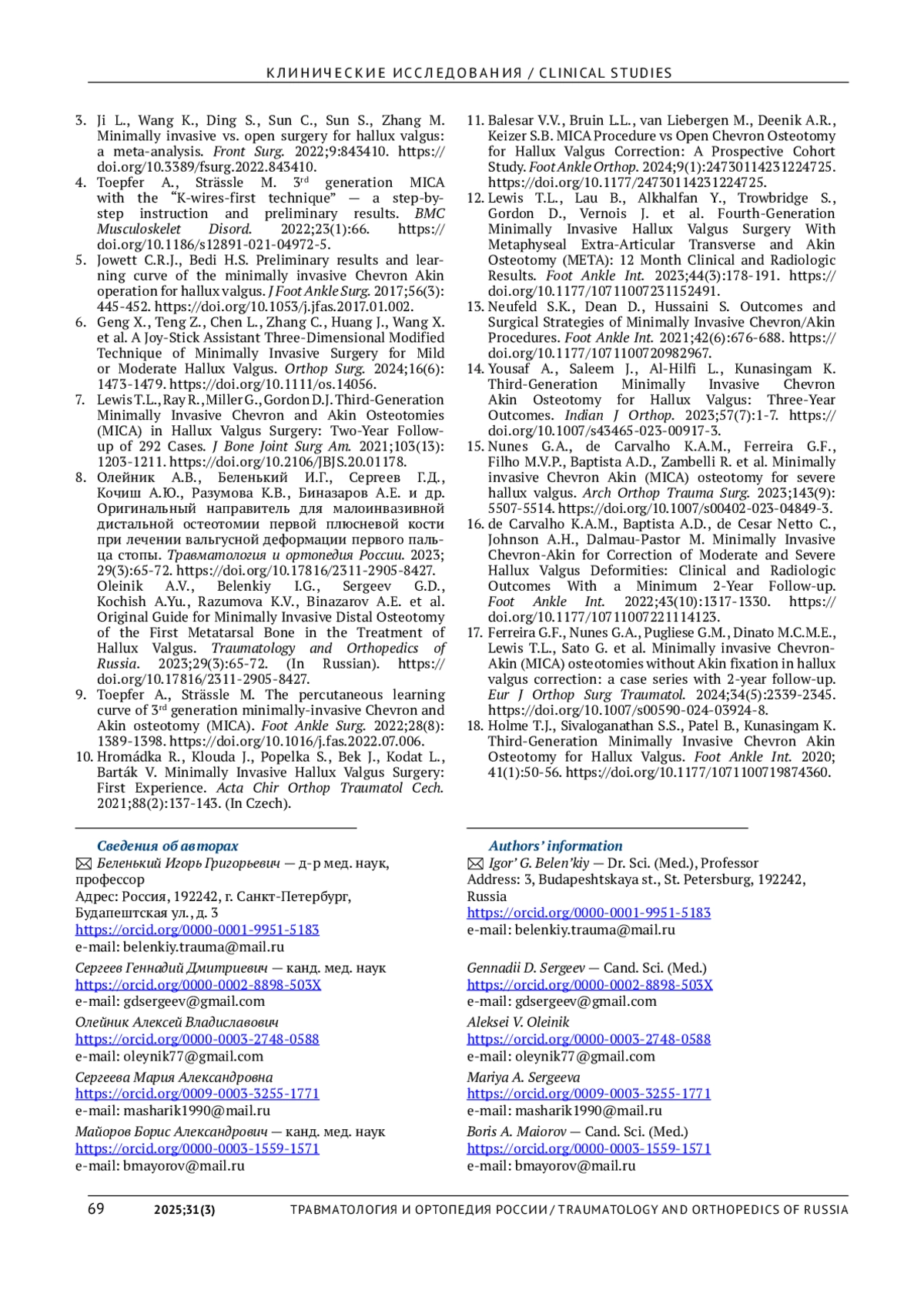 14. Yousaf A., Saleem J., Al-Hilfi L., Kunasingam K. Third-Generation Minimally Invasive Chevron Akin Osteotomy for Hallux Valgus: Three-Year Outcomes. Indian J Orthop. 2023;57(7):1-7. DOI: 10.1007/s43465-023-00917-3