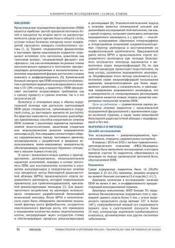 Проксимальная подошвенная фасциопатия (ППФ) является наиболее частой причиной пяточных болей и находится на втором месте по распространенности среди всех причин боли в области стопы, уступая только болевому синдрому после повреждений связочного аппарата голеностопного сустава [1, 2]. Термин «подошвенная фасциопатия» в настоящее время максимально корректно определяет истинную суть патологии, известную как «пяточная шпора», «подошвенный фасциит» или «фасциоз», так как возникающие на разных этапах патологического процесса и постепенно прогрессирующие дегенеративные и воспалительные изменения подошвенной фасции достаточно сложно выявлять и дифференцировать [3]. Хронический болевой синдром при ППФ отличается устойчивостью к рутинным вариантам консервативного лечения в 10–20% случаев, а пациенты с ППФ предъявляют постоянно возрастающие требования как к самому процессу и срокам лечения, так и к его результатам [4].
