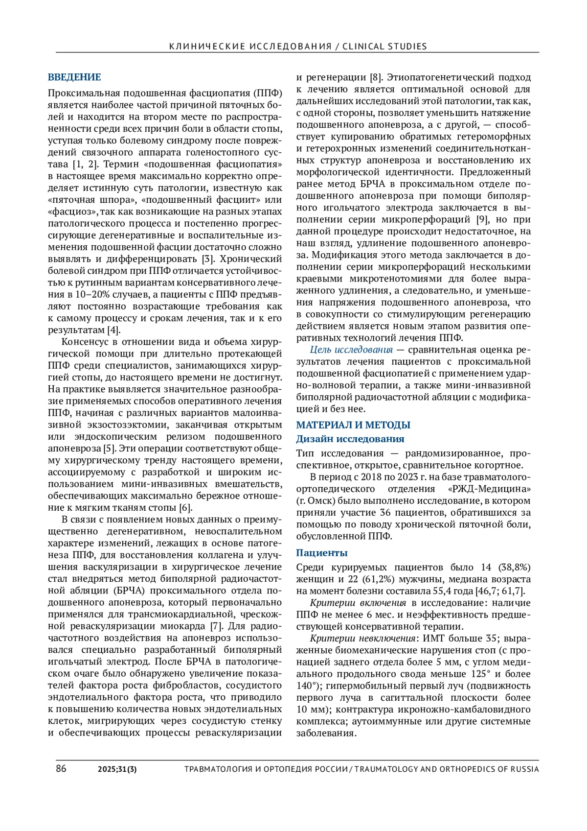 Цель исследования — сравнительная оценка результатов лечения пациентов с проксимальной подошвенной фасциопатией с применением ударно-волновой терапии, а также мини-инвазивной биполярной радиочастотной абляции с модификацией и без нее.