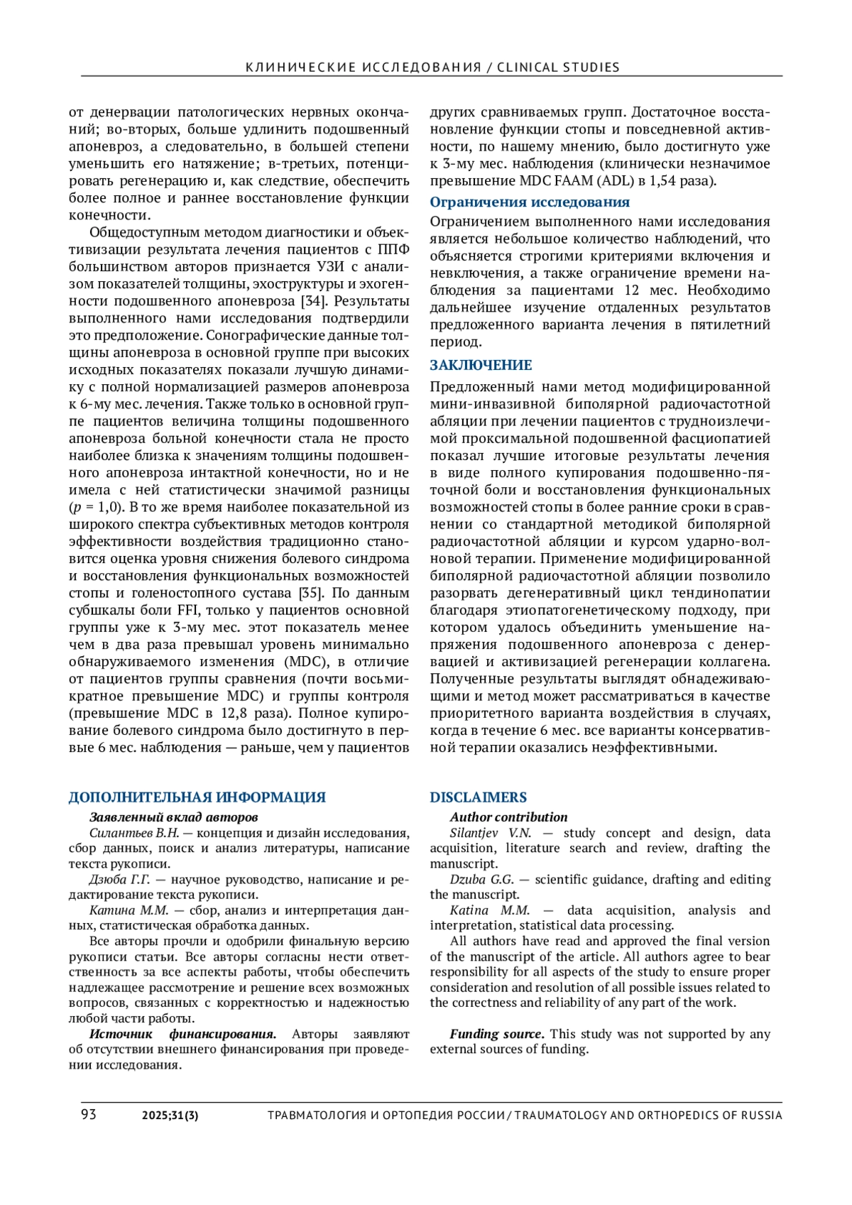 Заключение. Модифицированный мини-инвазивный метод радиочастотной абляции при лечении пациентов с проксимальной подошвенной фасциопатией показал лучшие итоговые результаты в более ранние сроки в сравнении со стандартной методикой абляции и курсом ударно-волновой терапии. Полученные результаты выглядят обнадеживающими, и метод может рассматриваться в качестве приоритетного варианта лечения в тех случаях, когда в течение 6 мес. были исчерпаны все варианты консервативной терапии.