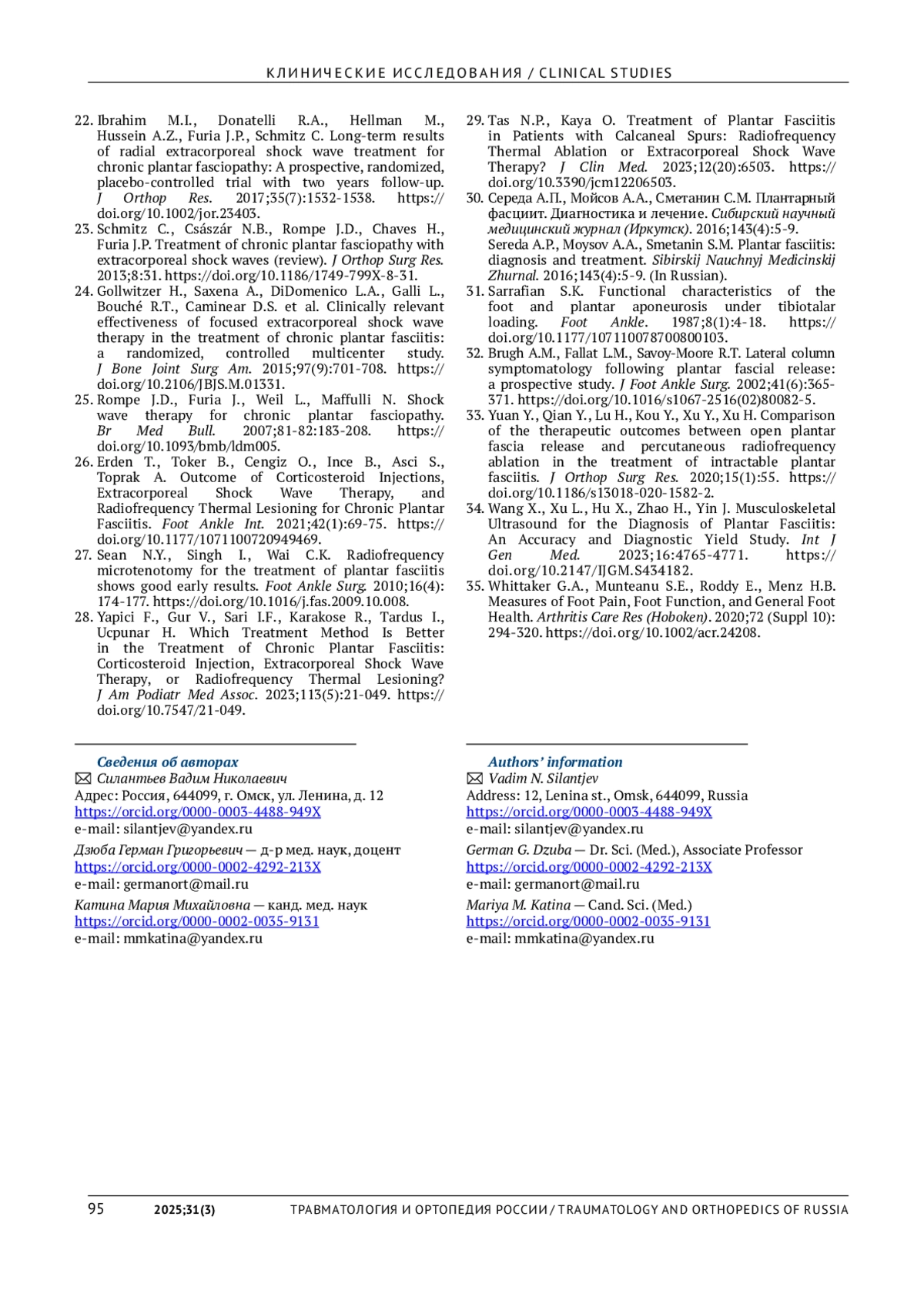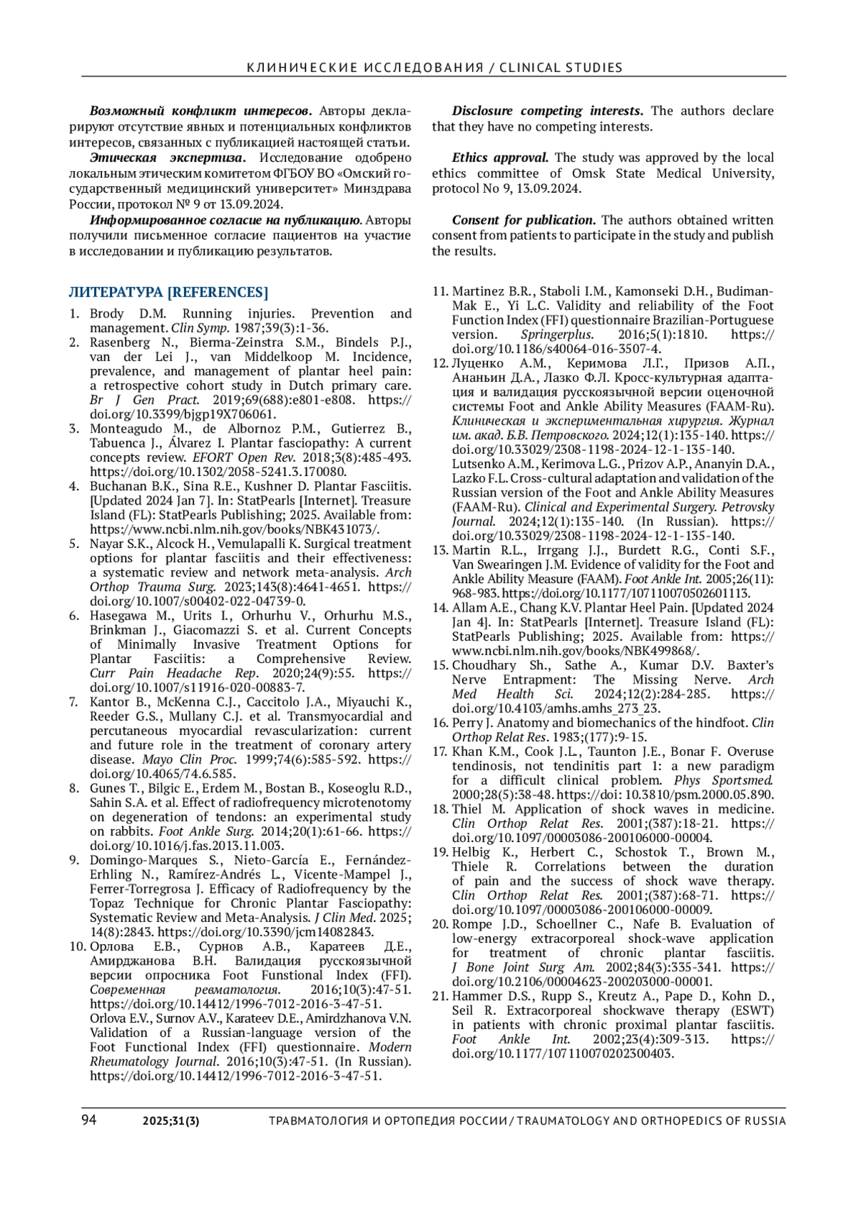 26. Erden T., Toker B., Cengiz O., Ince B., Asci S., Toprak A. Outcome of Corticosteroid Injections, Extracorporeal Shock Wave Therapy, and Radiofrequency Thermal Lesioning for Chronic Plantar Fasciitis. Foot Ankle Int. 2021;42(1):69-75. DOI: 10.1177/1071100720949469