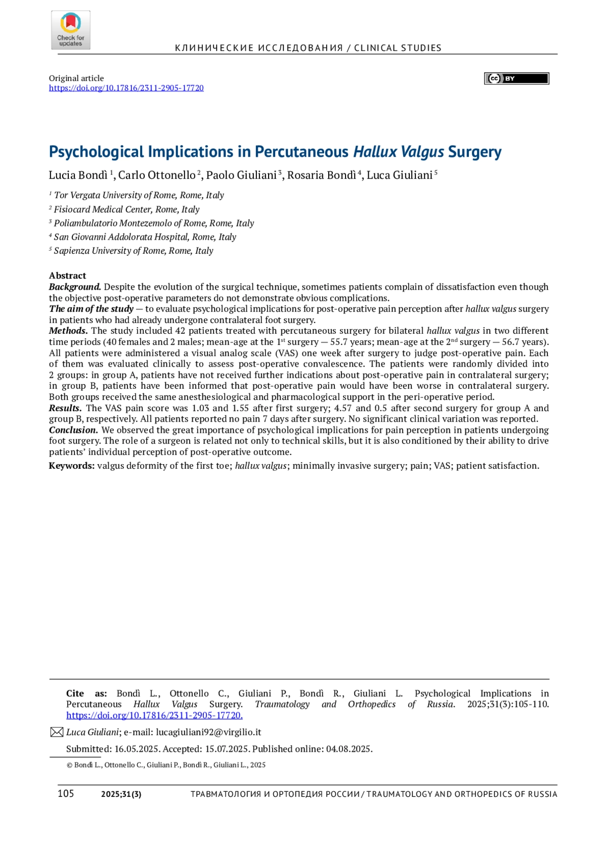Conclusion. We observed the great importance of psychological implications for pain perception in patients undergoing foot surgery. The role of a surgeon is related not only to technical skills, but it is also conditioned by their ability to drive patients’ individual perception of post-operative outcome.
