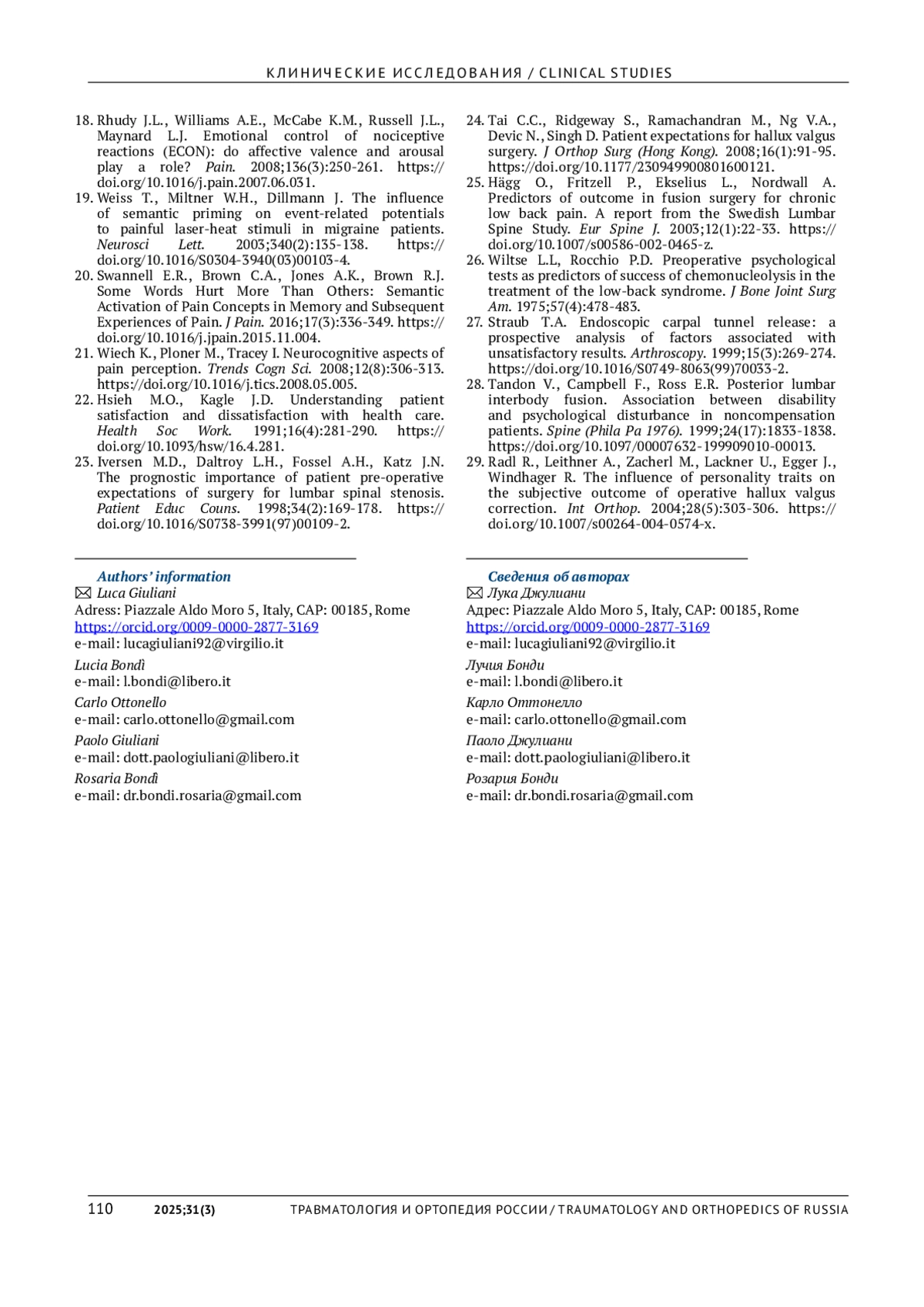 Заключение. Психологические аспекты восприятия боли пациентами, перенесшими операцию на стопе, имеют большое значение. Влияние хирурга на исход лечения обусловлено не только его техническими навыками, но и возможностью влиять на индивидуальное восприятие пациентами результатов операционного вмешательства.