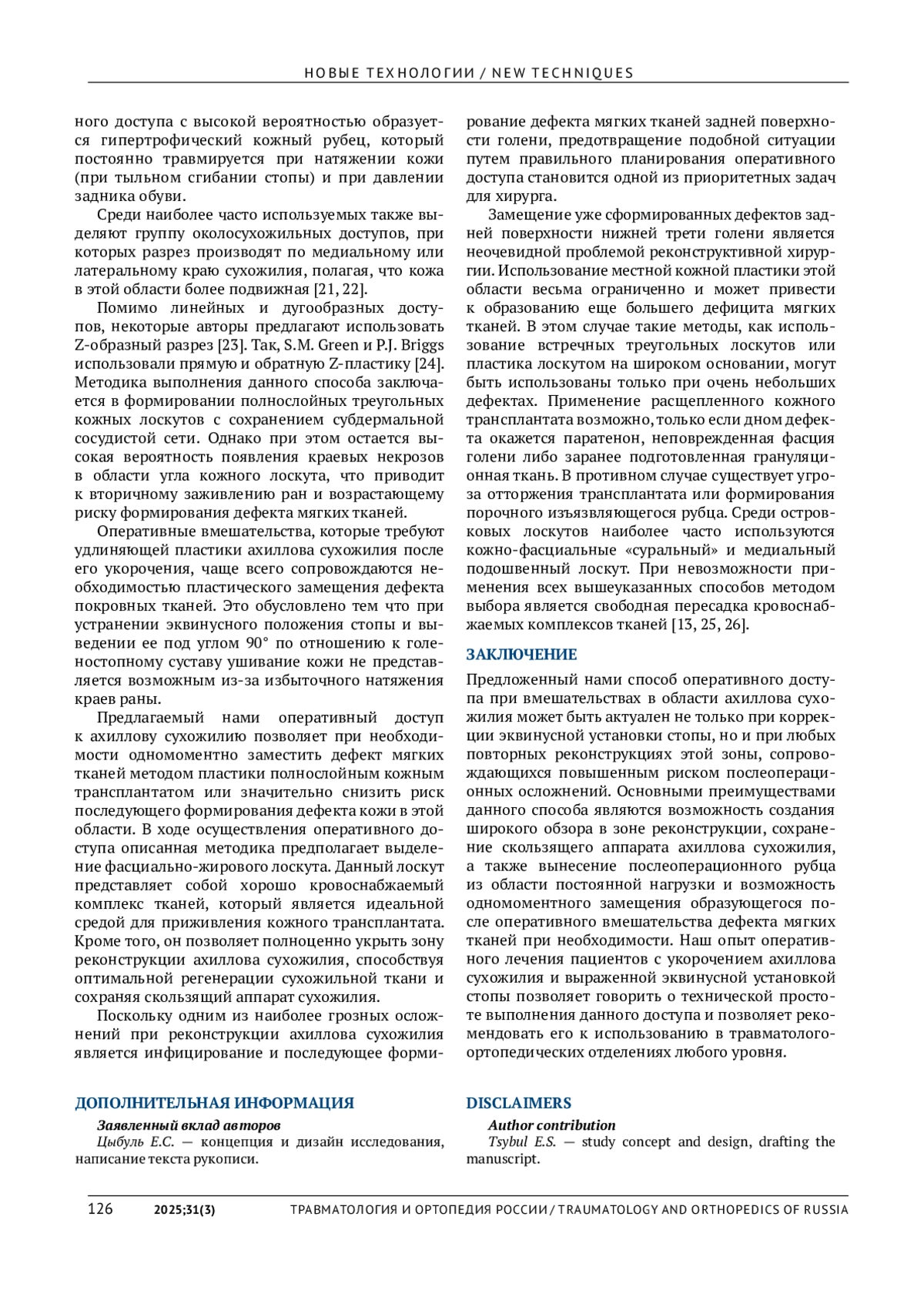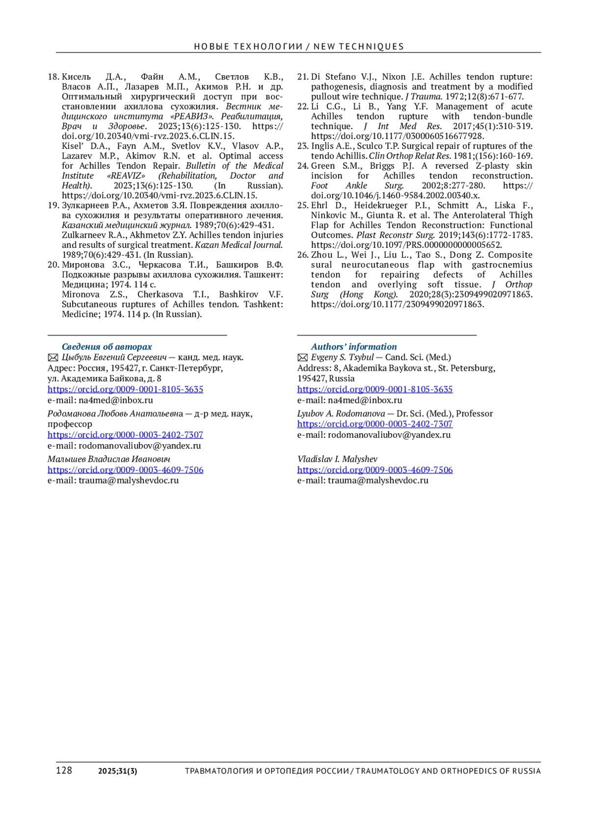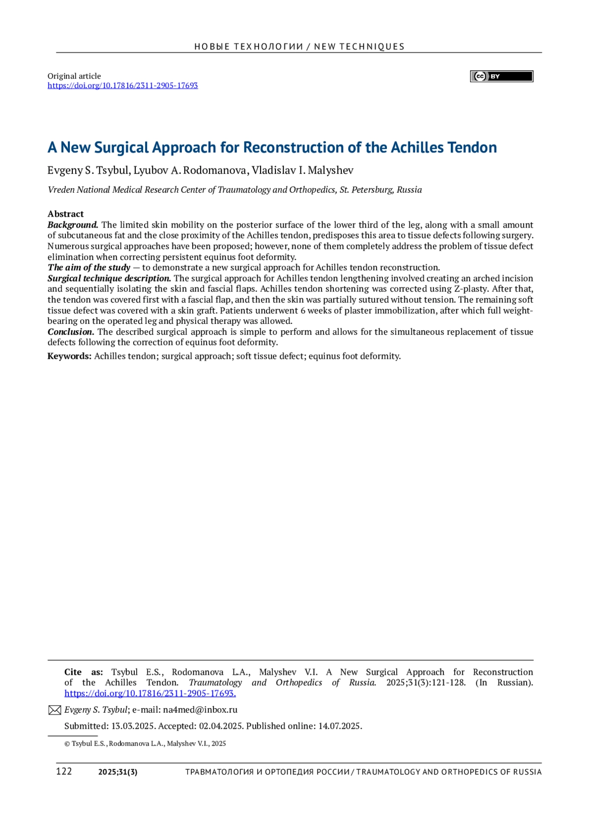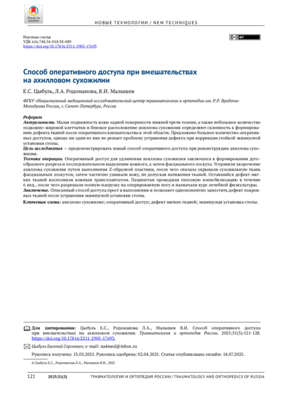ЦЫБУЛЬ Е. С., РОДОМАНОВА Л. А., МАЛЫШЕВ В. И. СПОСОБ ОПЕРАТИВНОГО ДОСТУПА ПРИ ВМЕШАТЕЛЬСТВАХ НА АХИЛЛОВОМ СУХОЖИЛИИ // ТРАВМАТОЛОГИЯ И ОРТОПЕДИЯ РОССИИ. 2025. № 3, ТОМ 31