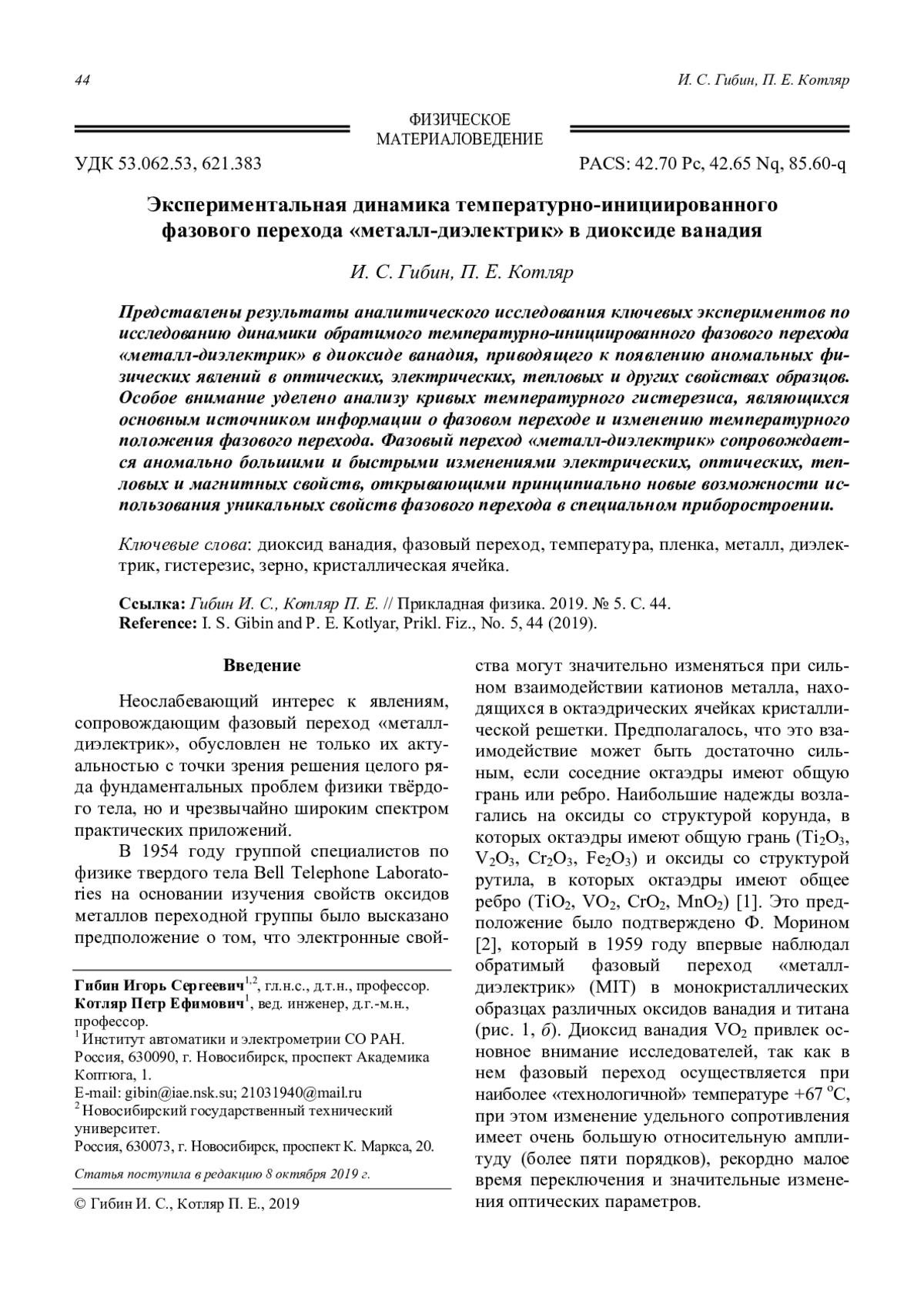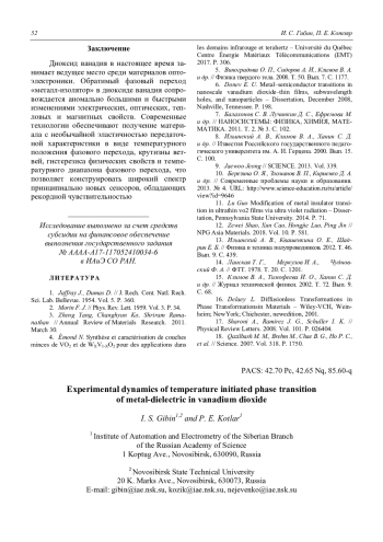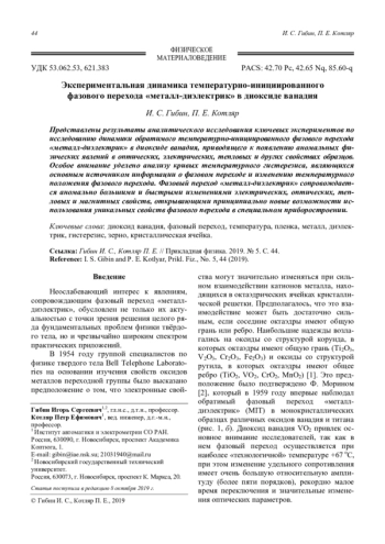 Гибин И. С., Котляр П. Е. Экспериментальная динамика температурно-инициированного фазового перехода «металл-диэлектрик» в диоксиде ванадия 44