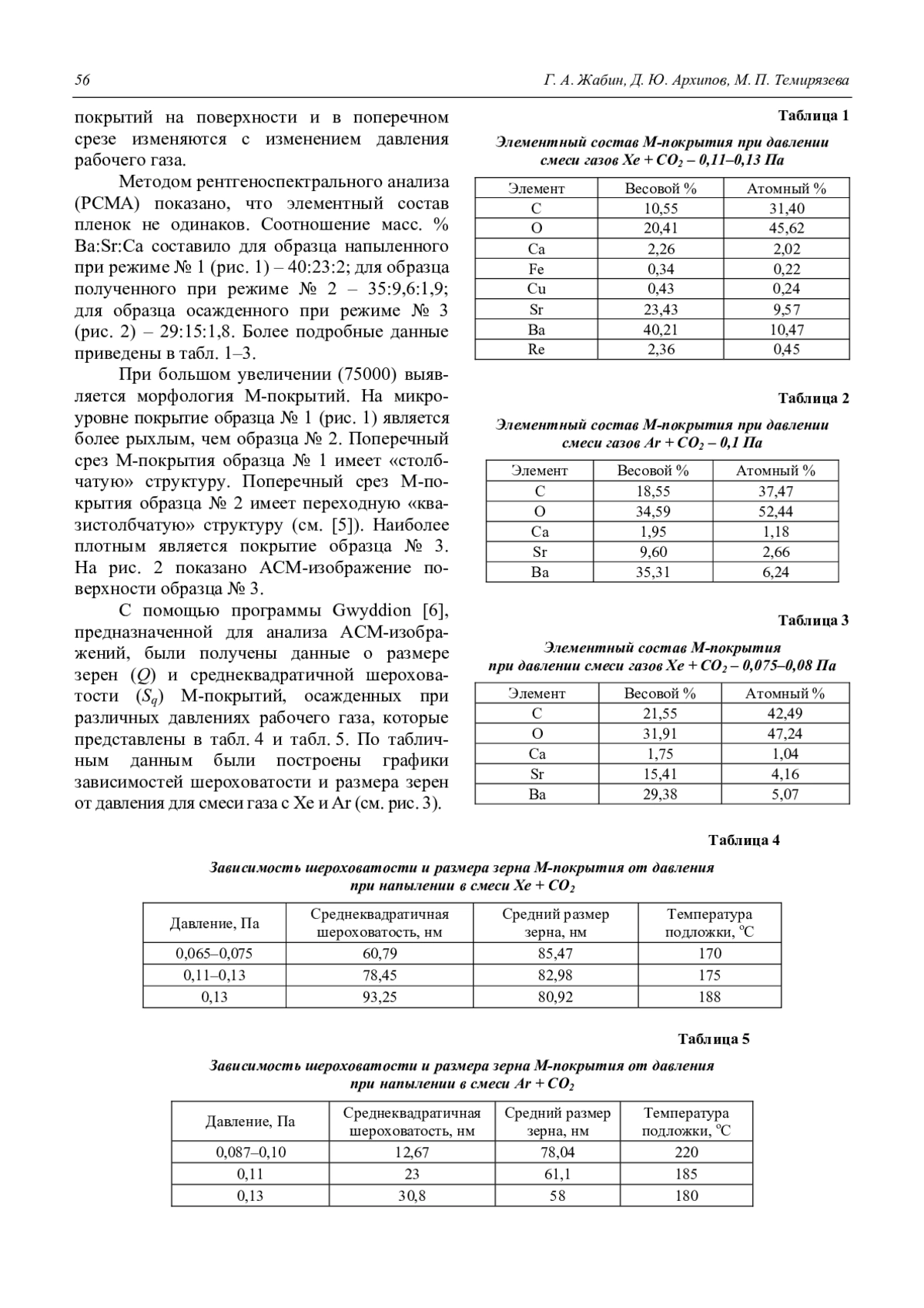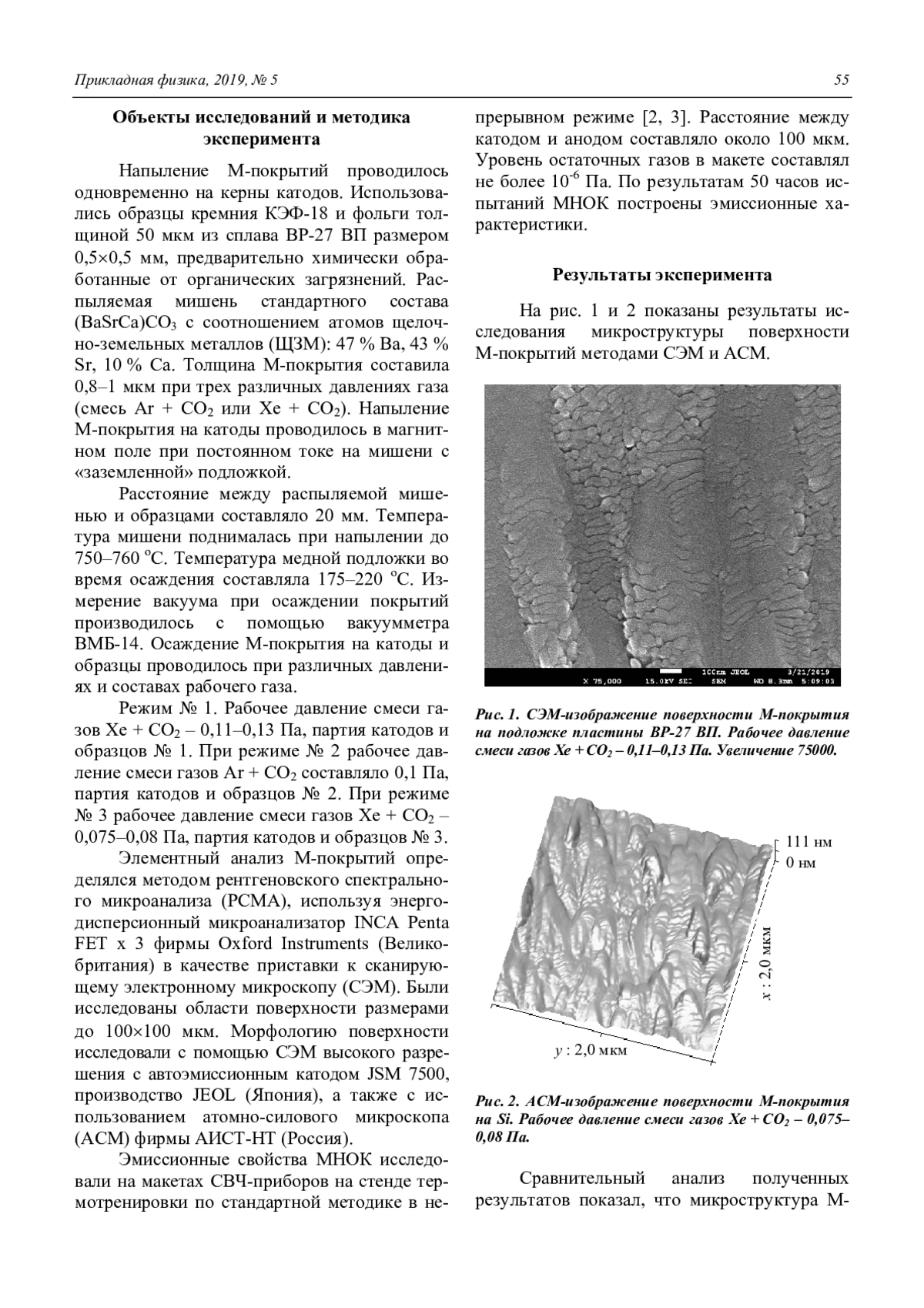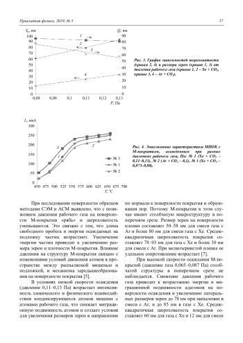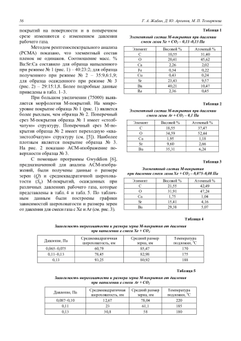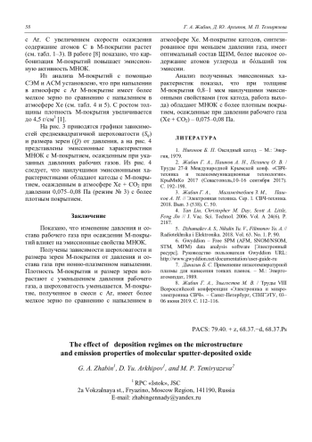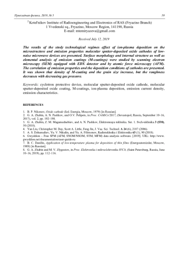 Представлены результаты исследования влияния технологических режимов ионноплазменного напыления на микроструктуру и эмиссионные свойства молекулярнонапыленных оксидных катодов (МНОК) малошумящих СВЧ-приборов. Методами сканирующей электронной микроскопии (СЭМ) с энергодисперсионной приставкой и атомно-силовой микроскопии (АСМ) исследована морфология поверхности, внутренняя структура, а также элементный анализ эмиссионных покрытий (М-покрытий). Показана зависимость эмиссионных свойств МНОК от условий осаждения покрытий. Плотность М-покрытия и размер зерен возрастают с уменьшением давления рабочего газа, а шероховатость уменьшается.