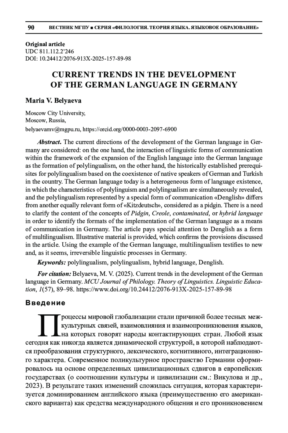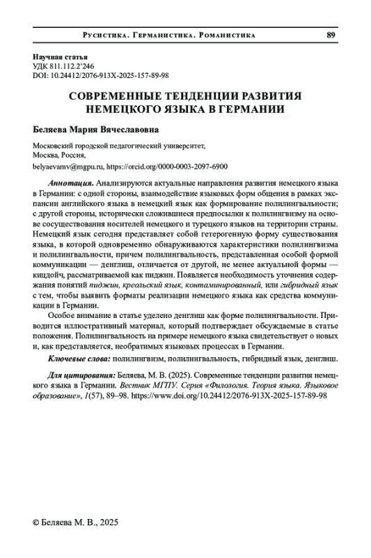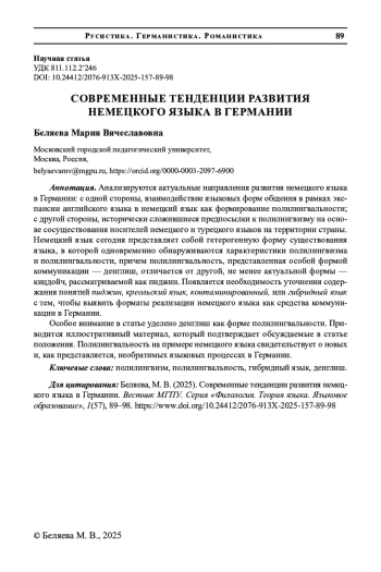 Особое внимание в статье уделено денглиш как форме полилингвальности. Приводится иллюстративный материал, который подтверждает обсуждаемые в статье положения. Полилингвальность на примере немецкого языка свидетельствует о новых и, как представляется, необратимых языковых процессах в Германии.