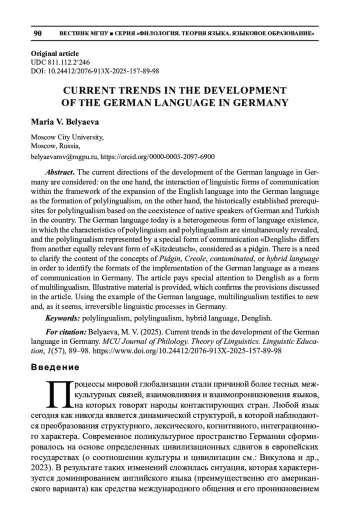 Анализируются актуальные направления развития немецкого языка в Германии: с одной стороны, взаимодействие языковых форм общения в рамках экспансии английского языка в немецкий язык как формирование полилингвальности; с другой стороны, исторически сложившиеся предпосылки к полилингвизму на основе сосуществования носителей немецкого и турецкого языков на территории страны. Немецкий язык сегодня представляет собой гетерогенную форму существования языка, в которой одновременно обнаруживаются характеристики полилингвизма и полилингвальности, причем полилингвальность, представленная особой формой коммуникации - денглиш, отличается от другой, не менее актуальной формы - кицдойч, рассматриваемой как пиджин. Появляется необходимость уточнения содержания понятий пиджин, креольский язык, контаминированный, или гибридный язык с тем, чтобы выявить форматы реализации немецкого языка как средства коммуникации в Германии.