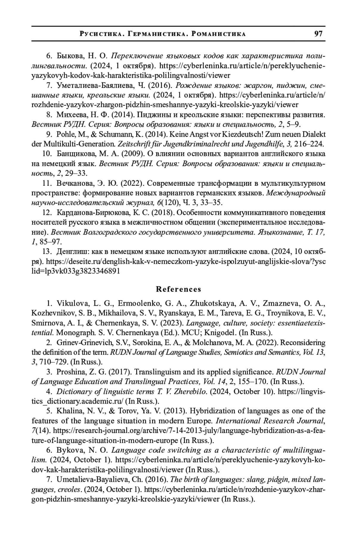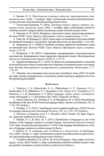 6. Быкова, Н. О. Переключение языковых кодов как характеристика полилингвальности. (2024, 1 октября). https://cyberleninka.ru/article/n/pereklyuchenie-yazykovyh-kodov-kak-harakteristika-polilingvalnosti/viewer.