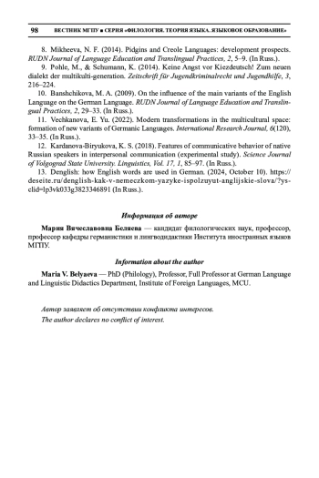 11. Вечканова, Э. Ю. (2022). Современные трансформации в мультикультурном пространстве: формирование новых вариантов германских языков. Международный научно-исследовательский журнал, 6(120), Ч. 3, 33-35.