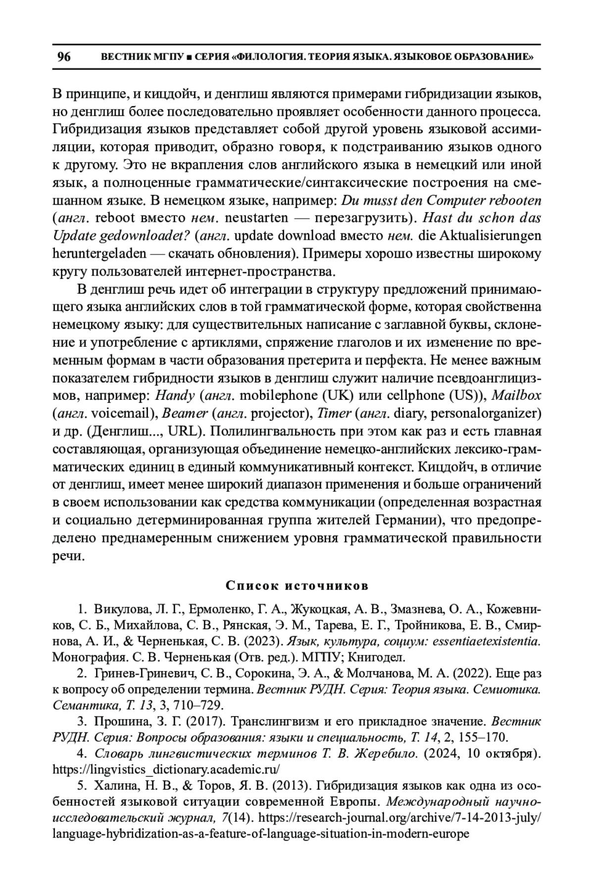 5. Халина, Н. В., & Торов, Я. В. (2013). Гибридизация языков как одна из особенностей языковой ситуации современной Европы. Международный научно-исследовательский журнал, 7(14). https://research-journal.org/archive/7-14-2013-july/language-hybridization-as-a-feature-of-language-situation-in-modern-europe. EDN: QYVAMB