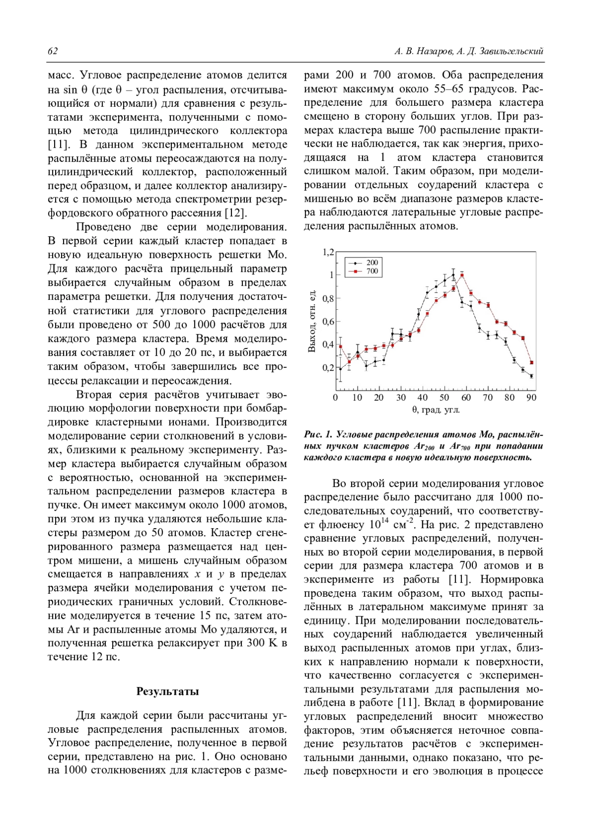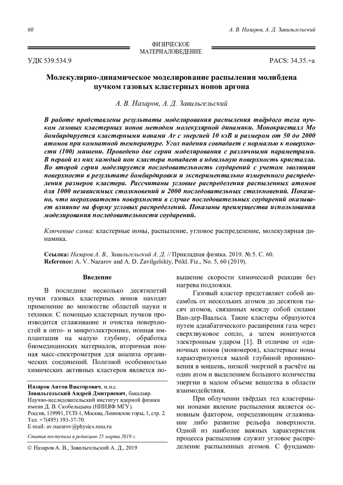 Назаров А. В., Завильгельский А. Д. Молекулярно-динамическое моделирование распыления молибдена пучком газовых кластерных ионов аргона 60