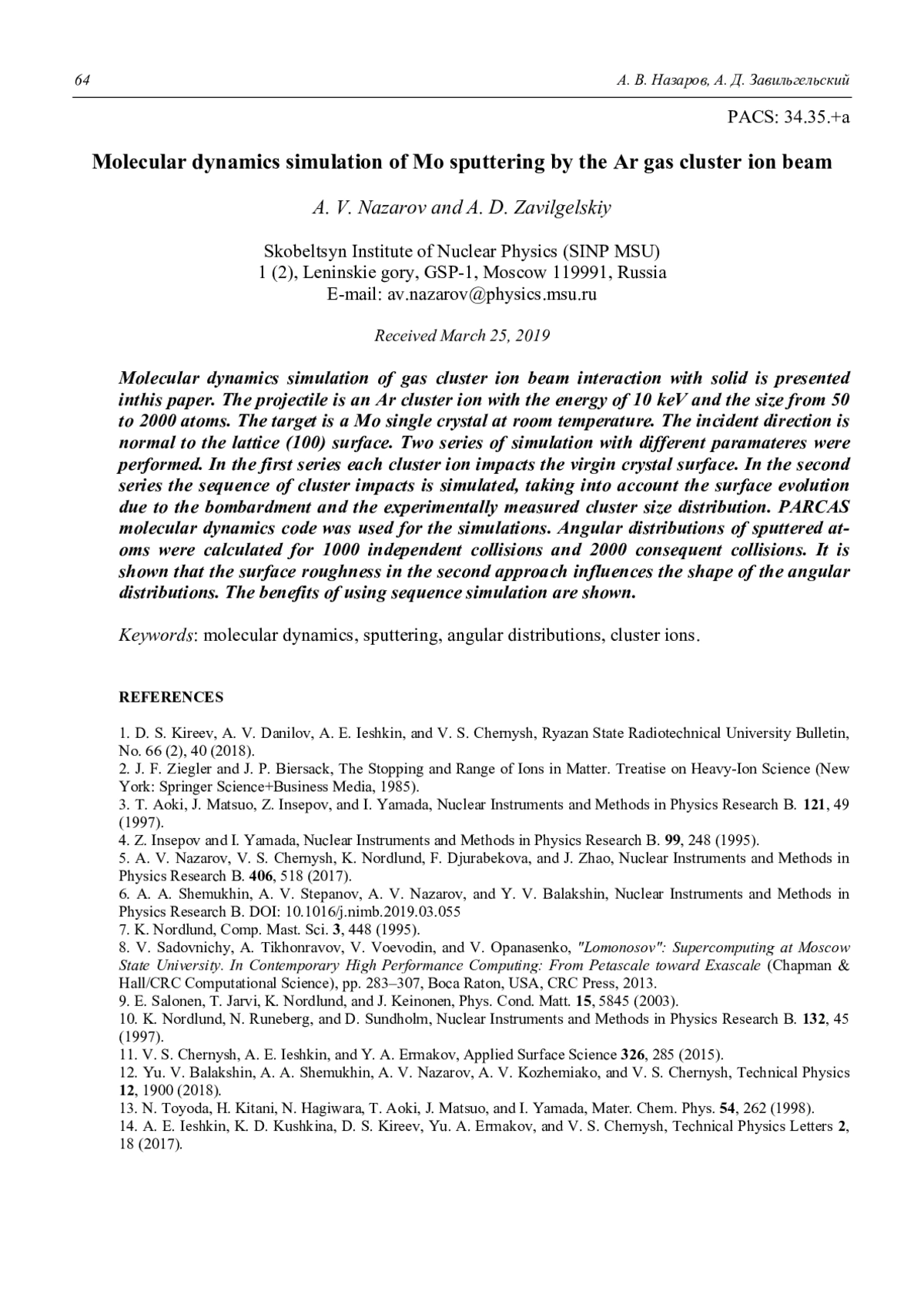 5. A. V. Nazarov, V. S. Chernysh, K. Nordlund, F. Djurabekova, and J. Zhao, Nuclear Instruments and Methods in Physics Research B. 406, 518 (2017).