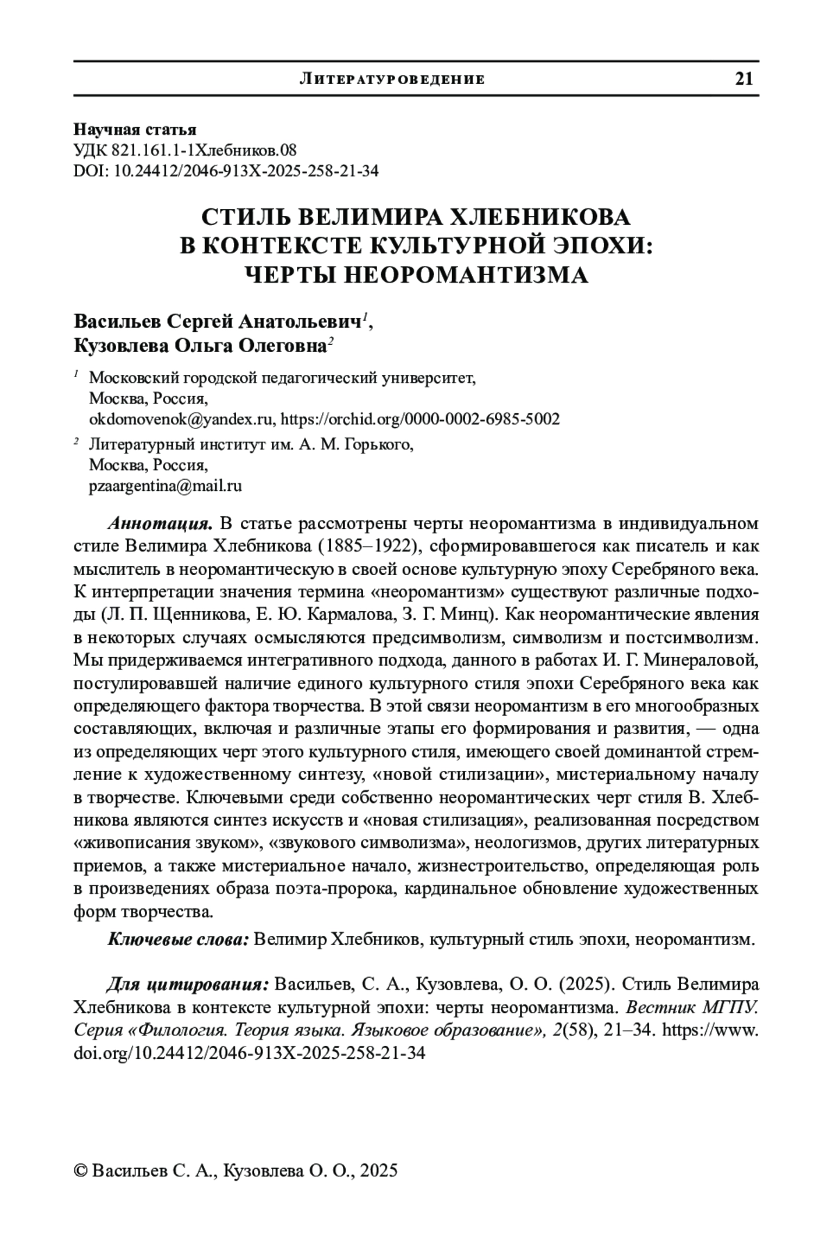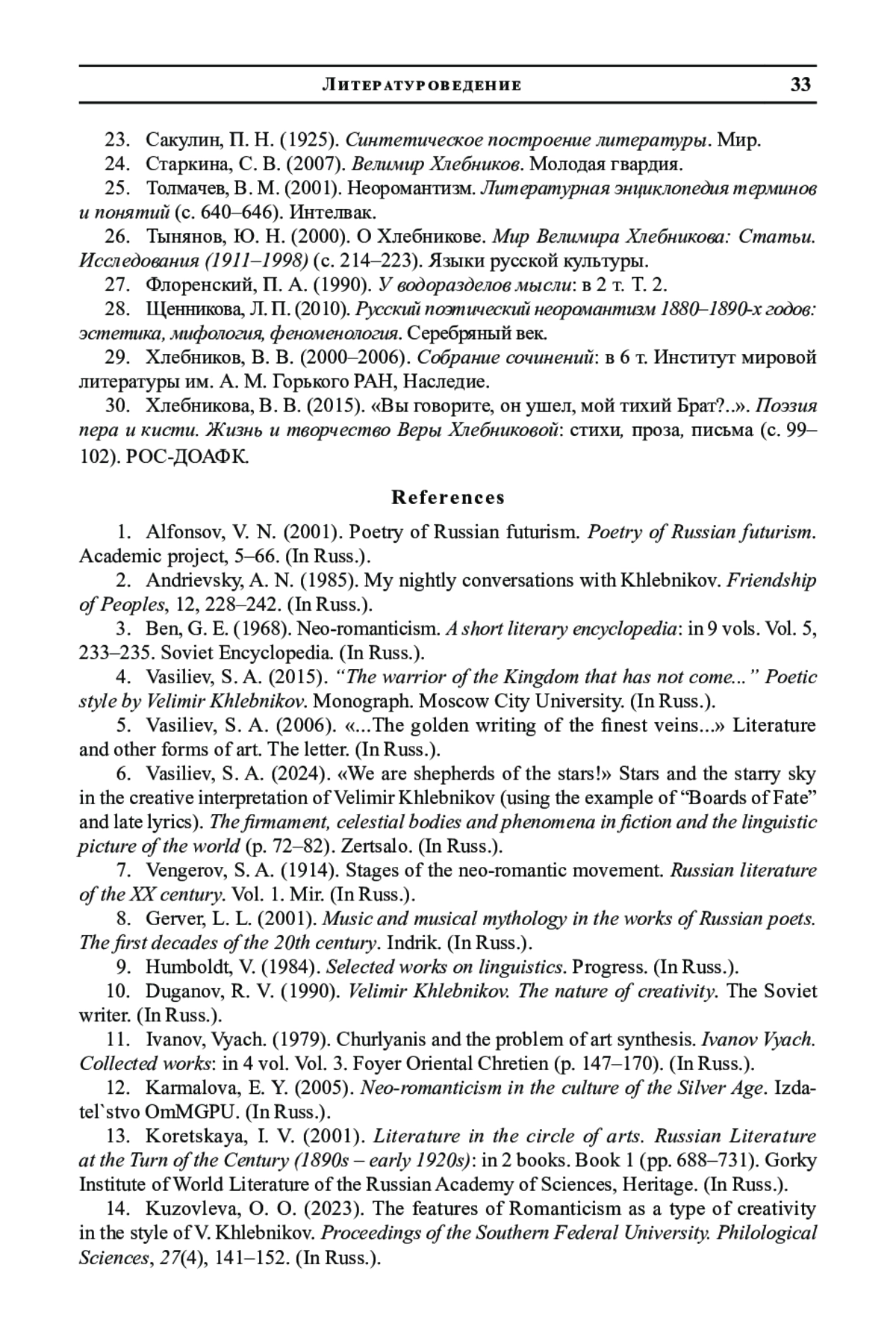14. Кузовлева, О. О. (2023). Черты романтизма как типа творчества в стиле В. Хлебникова. Известия Южного федерального университета. Филологические науки, 27(4), 141-152. EDN: XRSXBL