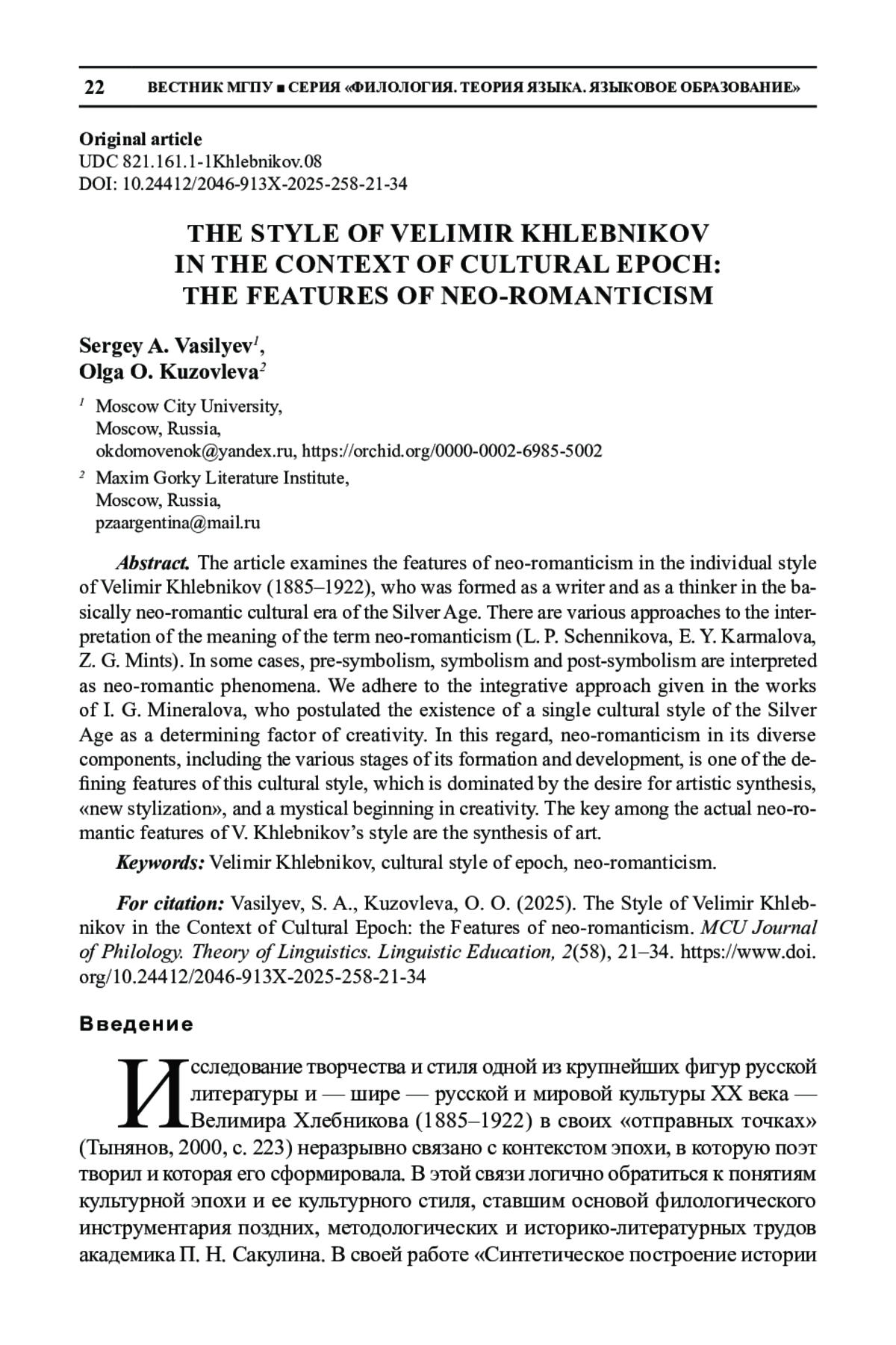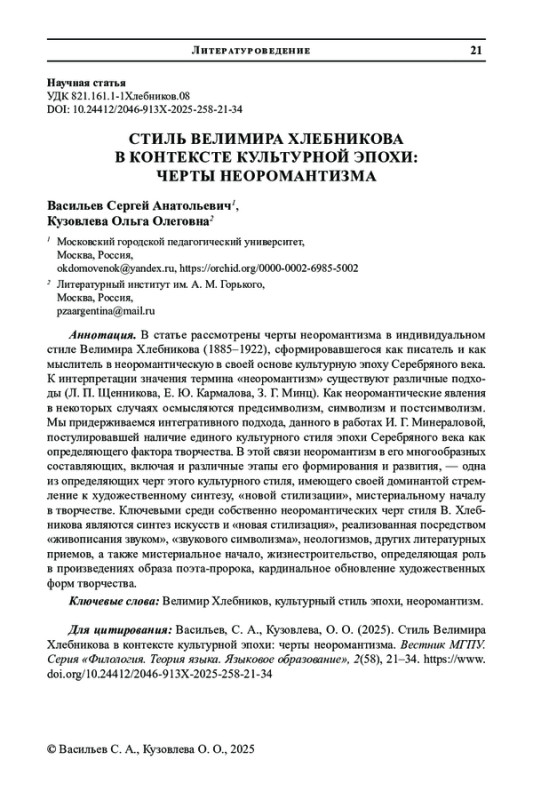 В статье рассмотрены черты неоромантизма в индивидуальном стиле Велимира Хлебникова (1885-1922), сформировавшегося как писатель и как мыслитель в неоромантическую в своей основе культурную эпоху Серебряного века. К интерпретации значения термина «неоромантизм» существуют различные подходы (Л. П. Щенникова, Е. Ю. Кармалова, З. Г. Минц). Как неоромантические явления в некоторых случаях осмысляются предсимволизм, символизм и постсимволизм. Мы придерживаемся интегративного подхода, данного в работах И. Г. Минераловой, постулировавшей наличие единого культурного стиля эпохи Серебряного века как определяющего фактора творчества. В этой связи неоромантизм в его многообразных составляющих, включая и различные этапы его формирования и развития, - одна из определяющих черт этого культурного стиля, имеющего своей доминантой стремление к художественному синтезу, «новой стилизации», мистериальному началу в творчестве. Ключевыми среди собственно неоромантических черт стиля В. Хлебникова являются синтез искусств и «новая стилизация», реализованная посредством «живописания звуком», «звукового символизма», неологизмов, других литературных приемов, а также мистериальное начало, жизнестроительство, определяющая роль в произведениях образа поэта-пророка, кардинальное обновление художественных форм творчества.