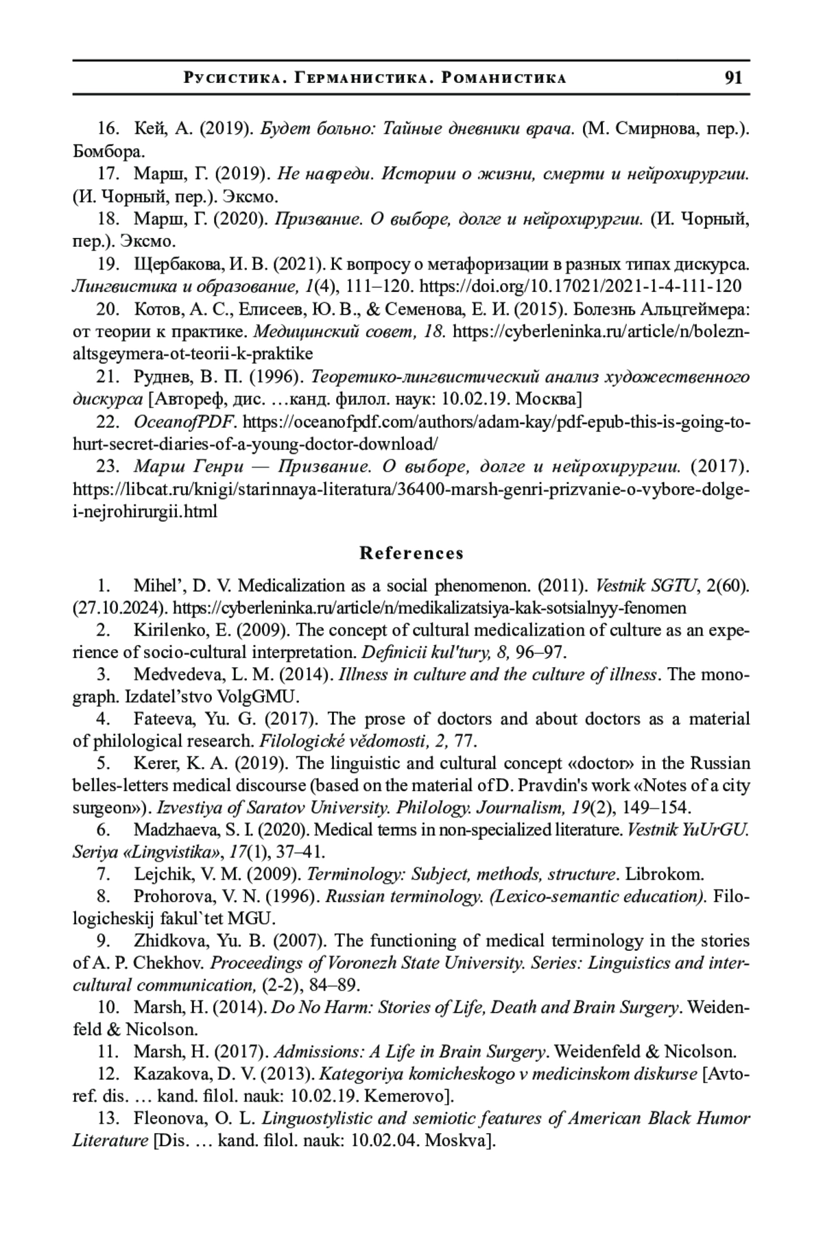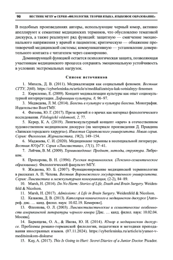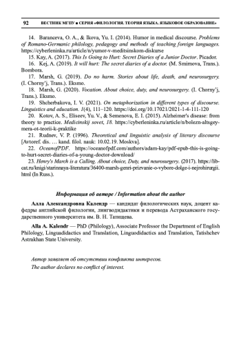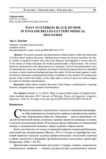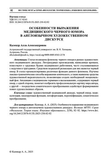 Статья: ОСОБЕННОСТИ ВЫРАЖЕНИЯ МЕДИЦИНСКОГО ЧЕРНОГО ЮМОРА В АНГЛОЯЗЫЧНОМ ХУДОЖЕСТВЕННОМ ДИСКУРСЕ (2025)