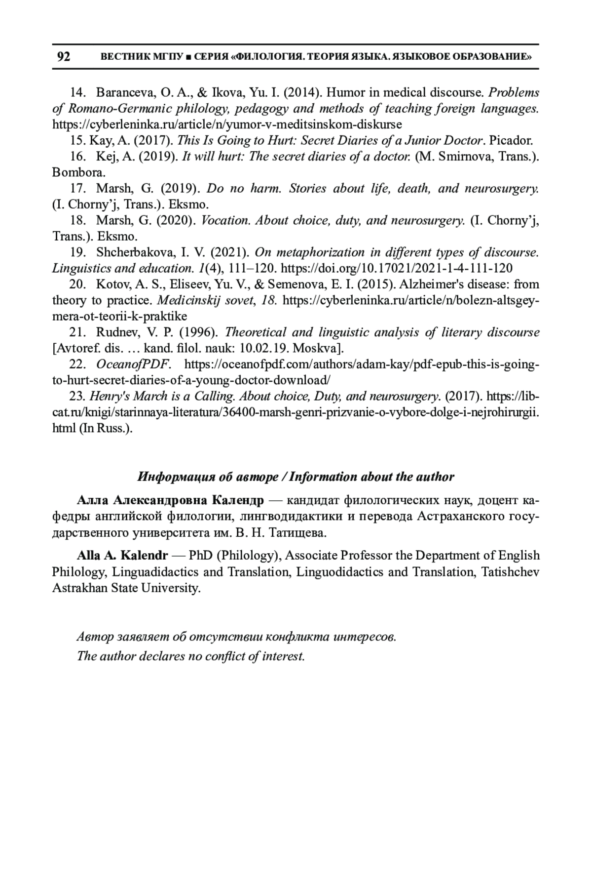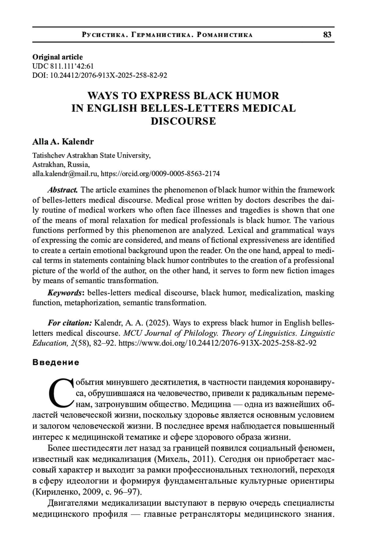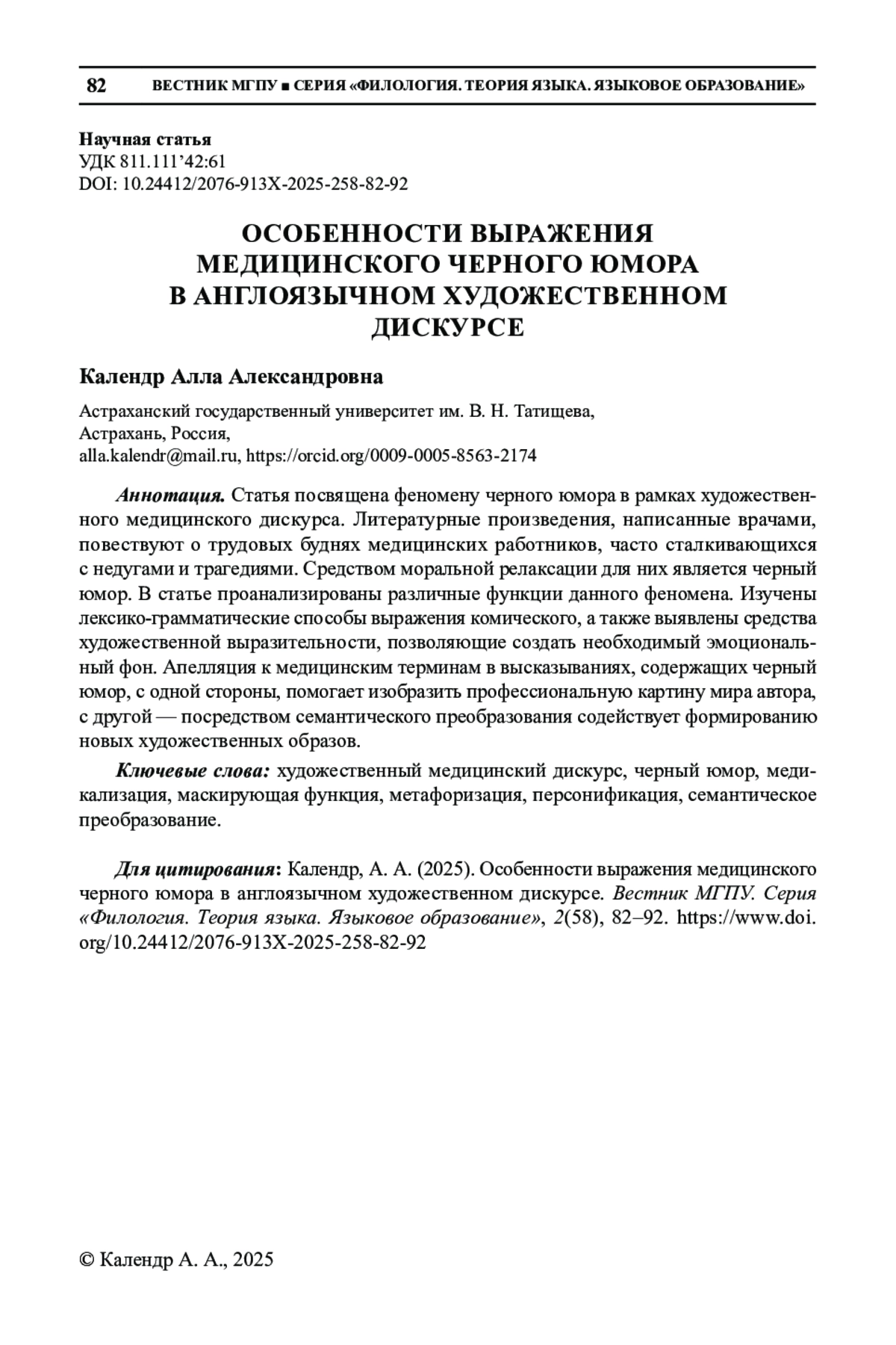 КАЛЕНДР А. А. ОСОБЕННОСТИ ВЫРАЖЕНИЯ МЕДИЦИНСКОГО ЧЕРНОГО ЮМОРА В АНГЛОЯЗЫЧНОМ ХУДОЖЕСТВЕННОМ ДИСКУРСЕ // ВЕСТНИК МГПУ. СЕРИЯ: ФИЛОЛОГИЯ. ТЕОРИЯ ЯЗЫКА. ЯЗЫКОВОЕ ОБРАЗОВАНИЕ. 2025. № 2 (58)