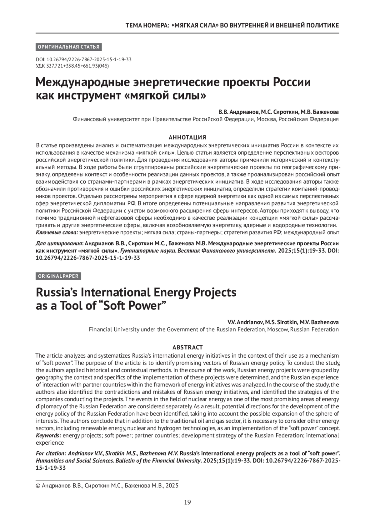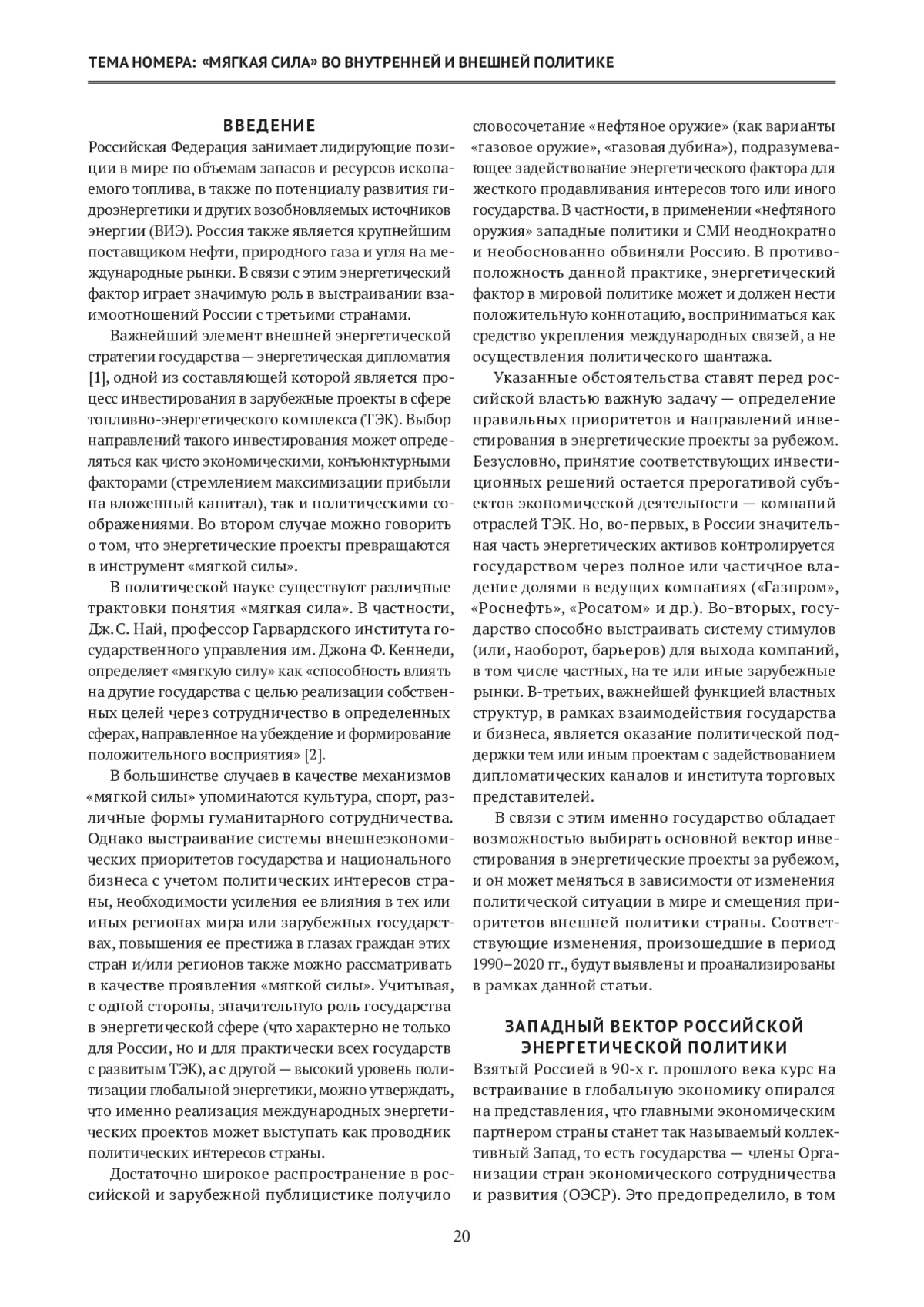 В статье произведены анализ и систематизация международных энергетических инициатив России в контексте их использования в качестве механизма «мягкой силы». Целью статьи является определение перспективных векторов российской энергетической политики. Для проведения исследования авторы применили исторический и контекстуальный методы. В ходе работы были сгруппированы российские энергетические проекты по географическому признаку, определены контекст и особенности реализации данных проектов, а также проанализирован российский опыт взаимодействия со странами-партнерами в рамках энергетических инициатив. В ходе исследования авторы также обозначили противоречия и ошибки российских энергетических инициатив, определили стратегии компаний-проводников проектов. Отдельно рассмотрены мероприятия в сфере ядерной энергетики как одной из самых перспективных сфер энергетической дипломатии РФ. В итоге определены потенциальные направления развития энергетической политики Российской Федерации с учетом возможного расширения сферы интересов. Авторы приходят к выводу, что помимо традиционной нефтегазовой сферы необходимо в качестве реализации концепции «мягкой силы» рассматривать и другие энергетические сферы, включая возобновляемую энергетику, ядерные и водородные технологии.