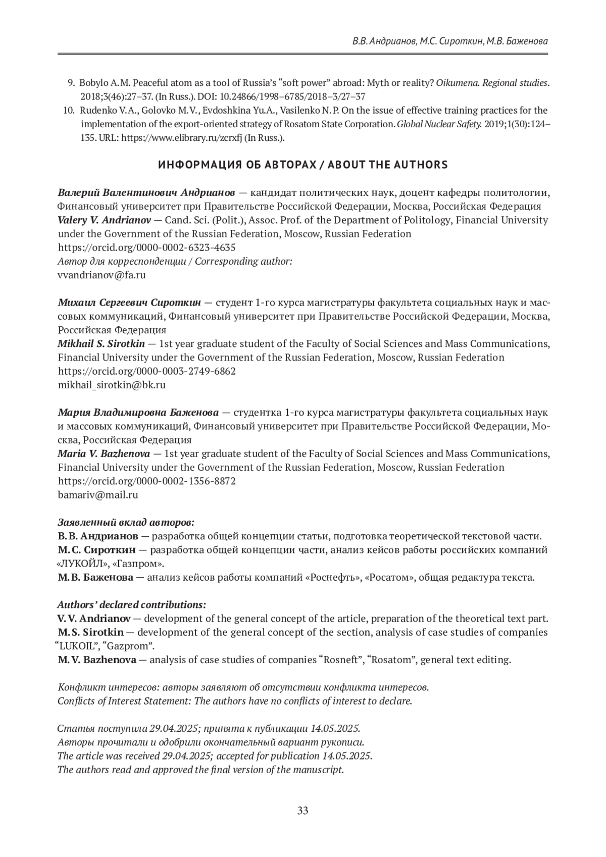 9. Бобыло А. М. Мирный атом как инструмент «мягкой силы» России за рубежом: миф или реальность? Ойкумена. Регионоведческие исследования. 2018;3(46):27-37. https://doi.org/10.24866/1998-6785/2018-3/27-37