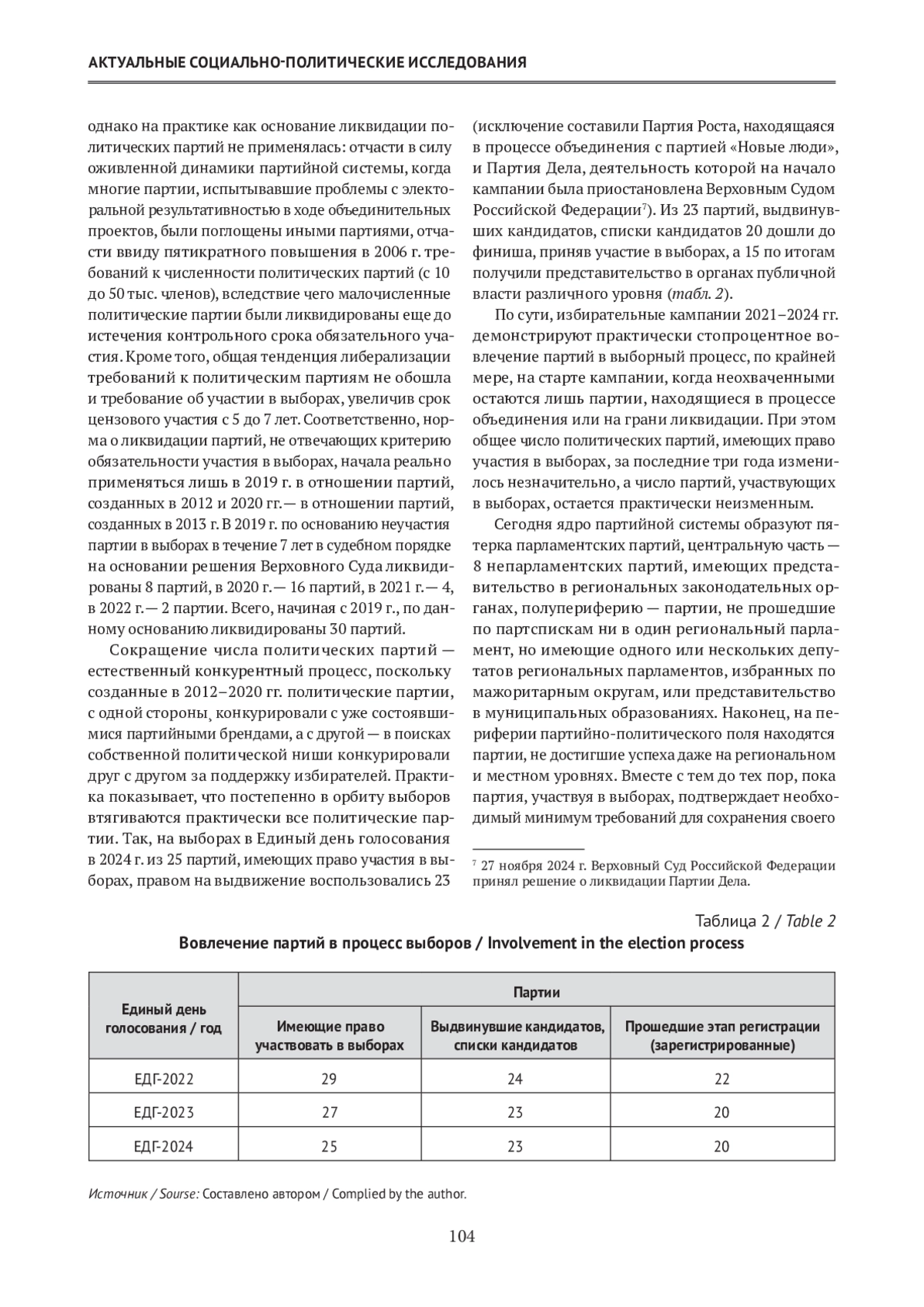 Цель исследования заключается в выработке подхода к периодизации развития партий и партийной системы Российской Федерации, основанной на предлагаемых базовых характеристиках партийной системы и описании этапов ее конфигурации в промежуток с 2012 по 2024 г.