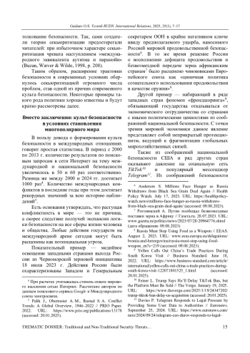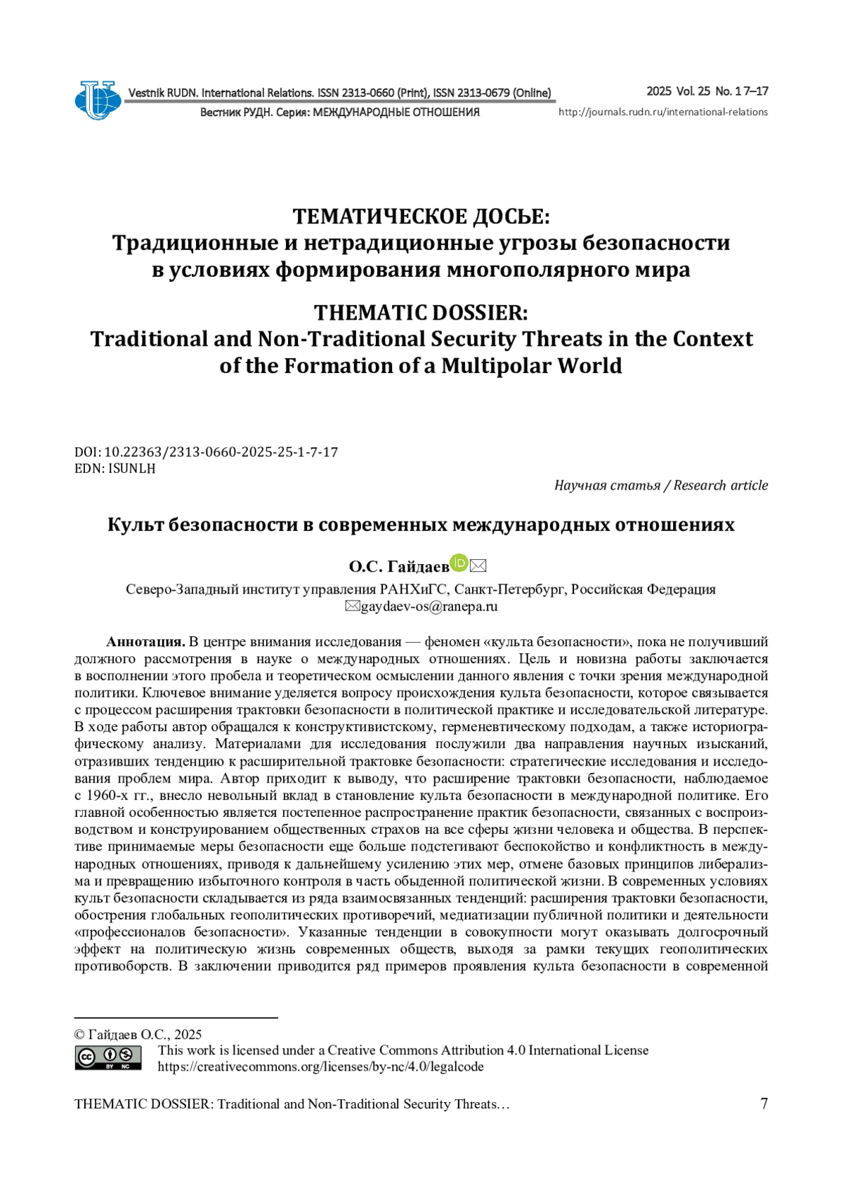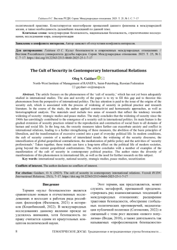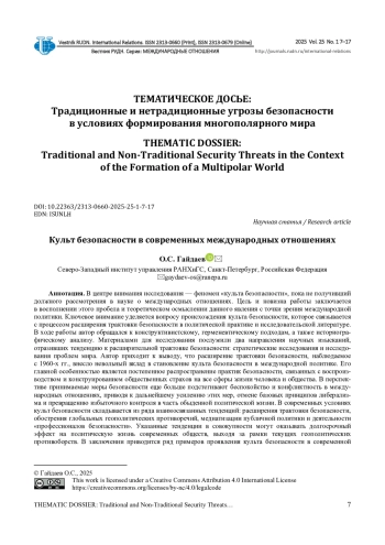 В центре внимания исследования - феномен «культа безопасности», пока не получивший должного рассмотрения в науке о международных отношениях. Цель и новизна работы заключается в восполнении этого пробела и теоретическом осмыслении данного явления с точки зрения международной политики. Ключевое внимание уделяется вопросу происхождения культа безопасности, которое связывается с процессом расширения трактовки безопасности в политической практике и исследовательской литературе. В ходе работы автор обращался к конструктивистскому, герменевтическому подходам, а также историографическому анализу. Материалами для исследования послужили два направления научных изысканий, отразивших тенденцию к расширительной трактовке безопасности: стратегические исследования и исследования проблем мира. Автор приходит к выводу, что расширение трактовки безопасности, наблюдаемое с 1960-х гг., внесло невольный вклад в становление культа безопасности в международной политике. Его главной особенностью является постепенное распространение практик безопасности, связанных с воспроизводством и конструированием общественных страхов на все сферы жизни человека и общества. В перспективе принимаемые меры безопасности еще больше подстегивают беспокойство и конфликтность в международных отношениях, приводя к дальнейшему усилению этих мер, отмене базовых принципов либерализма и превращению избыточного контроля в часть обыденной политической жизни. В современных условиях культ безопасности складывается из ряда взаимосвязанных тенденций: расширения трактовки безопасности, обострения глобальных геополитических противоречий, медиатизации публичной политики и деятельности «профессионалов безопасности». Указанные тенденции в совокупности могут оказывать долгосрочный эффект на политическую жизнь современных обществ, выходя за рамки текущих геополитических противоборств. В заключении приводится ряд примеров проявления культа безопасности в современной политической практике. Констатируется многообразие проявлений данного феномена в международной жизни, а также необходимость дальнейших изысканий по данной теме.