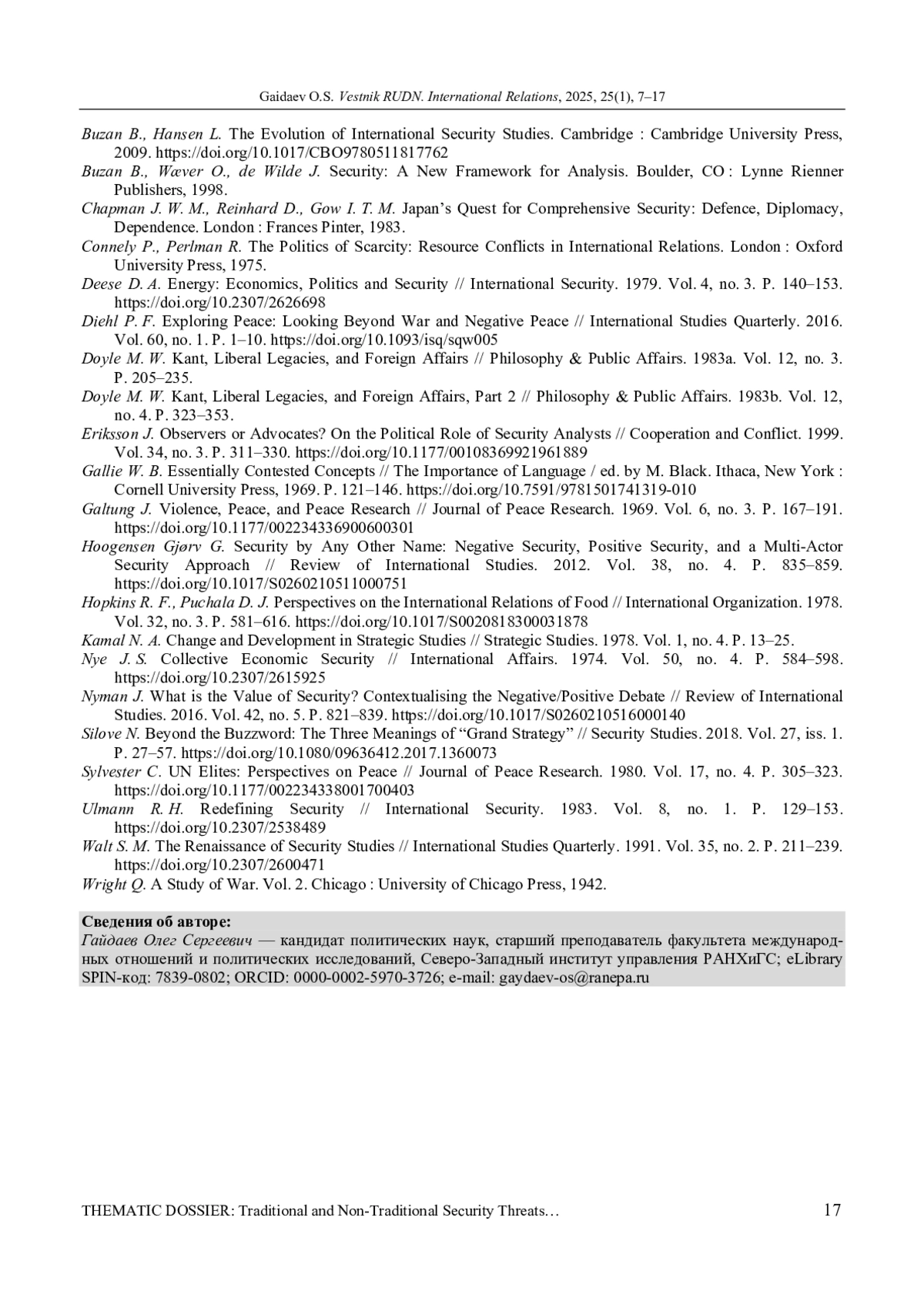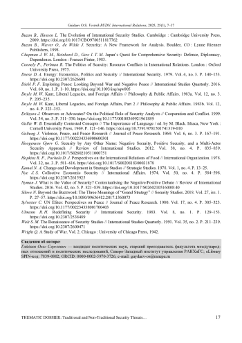 9. Ланцов С. А., Усмонов Ф. И. Проблемы безопасности в теории международных отношений: сравнительный анализ основных направлений // Политическая экспертиза: ПОЛИТЭКС. 2008. Т. 4, № 2. С. 151-163. EDN: KOHCQF