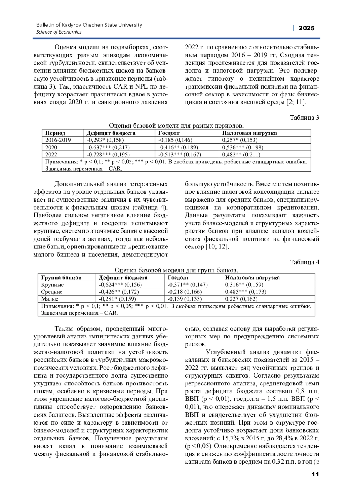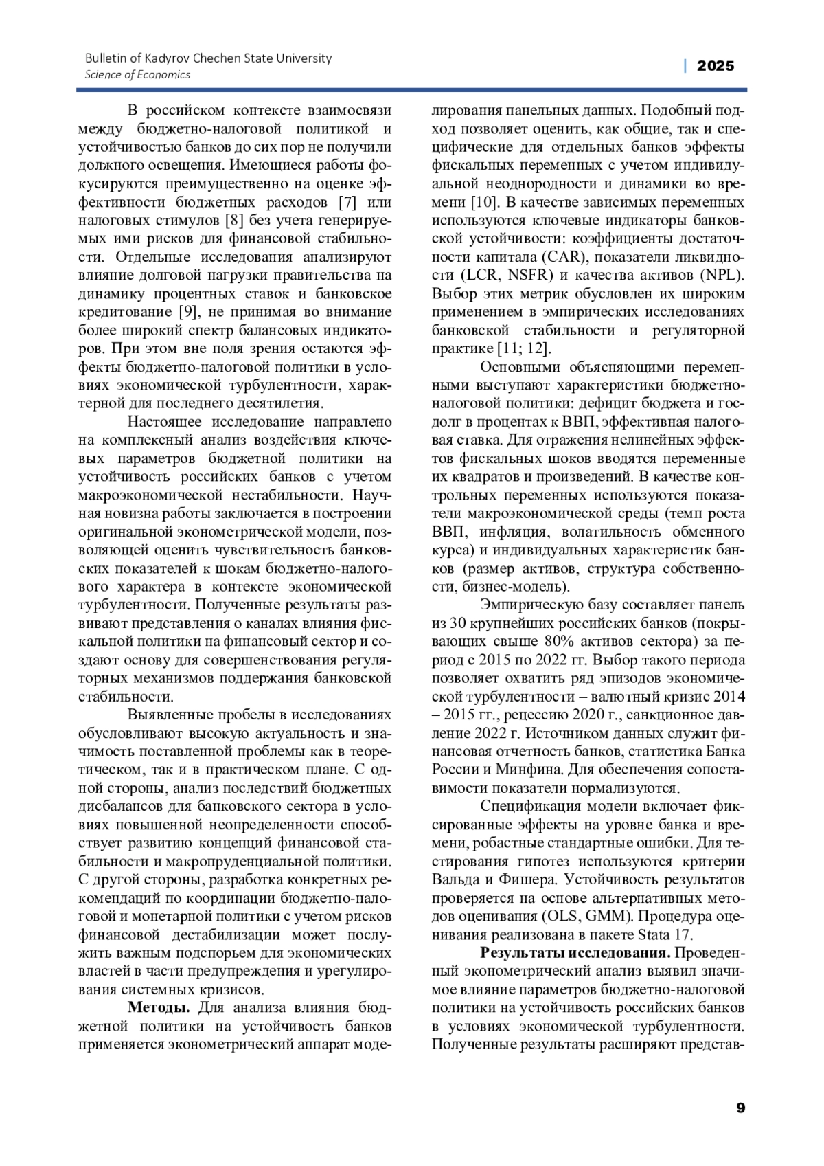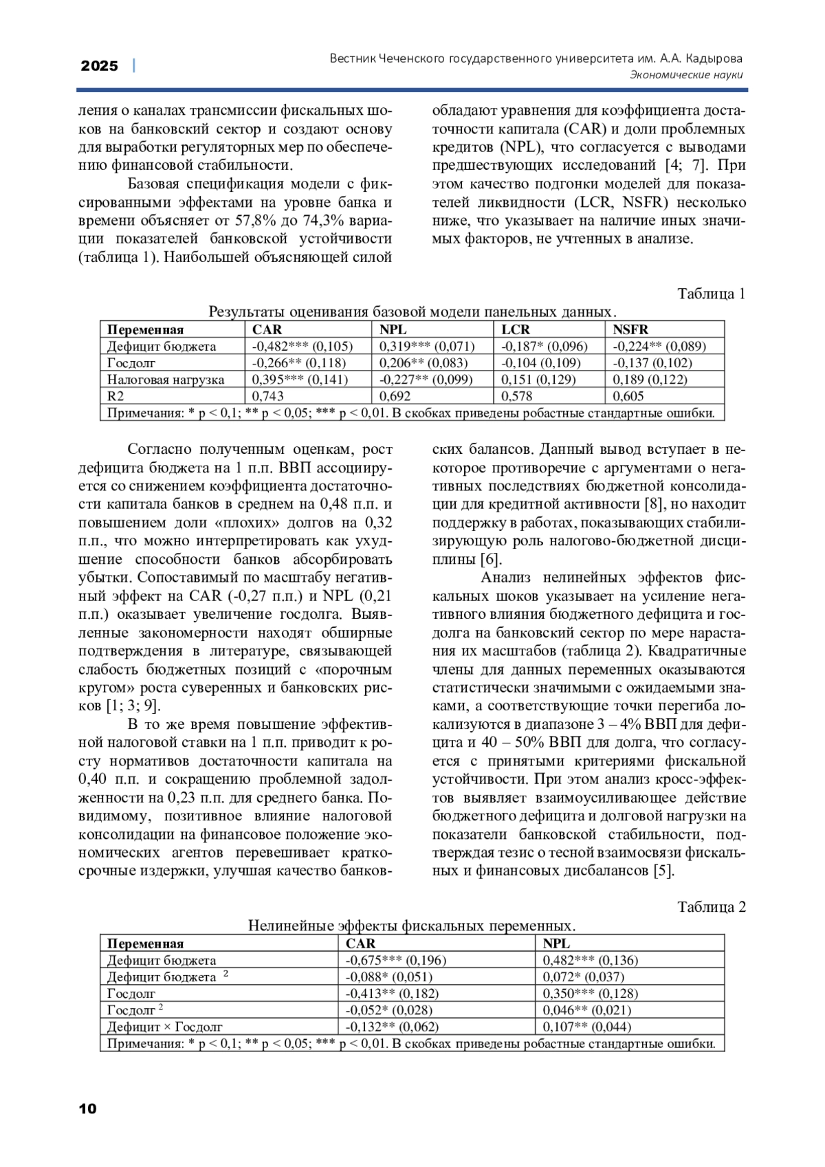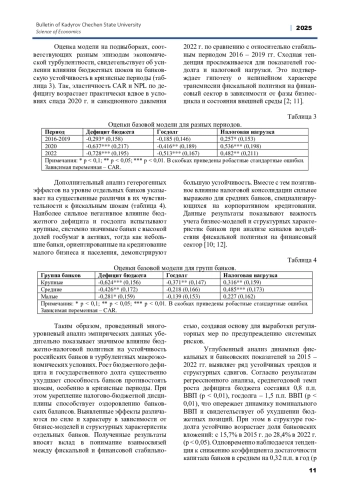 В российском контексте взаимосвязи между бюджетно-налоговой политикой и устойчивостью банков до сих пор не получили должного освещения. Имеющиеся работы фокусируются преимущественно на оценке эффективности бюджетных расходов [7] или налоговых стимулов [8] без учета генерируемых ими рисков для финансовой стабильности. Отдельные исследования анализируют влияние долговой нагрузки правительства на динамику процентных ставок и банковское кредитование [9], не принимая во внимание более широкий спектр балансовых индикаторов. При этом вне поля зрения остаются эффекты бюджетно-налоговой политики в условиях экономической турбулентности, характерной для последнего десятилетия.