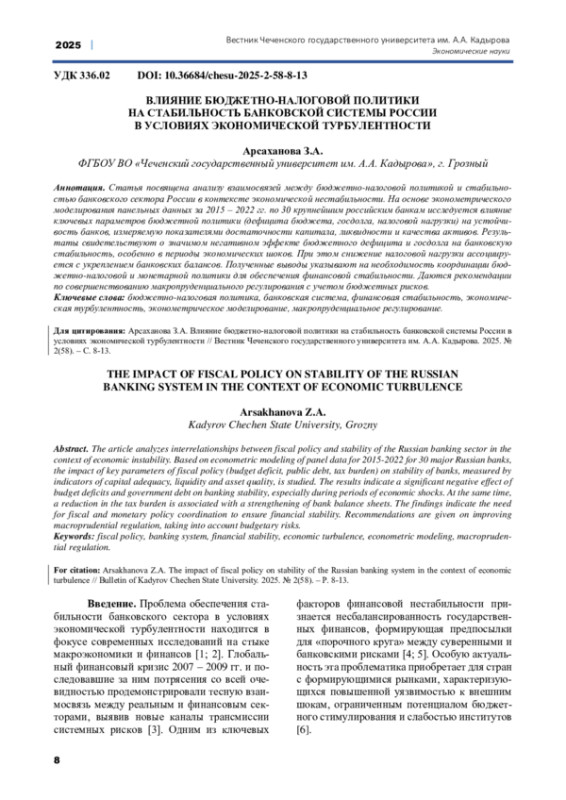 Статья посвящена анализу взаимосвязей между бюджетно-налоговой политикой и стабильностью банковского сектора России в контексте экономической нестабильности. На основе эконометрического моделирования панельных данных за 2015 - 2022 гг. по 30 крупнейшим российским банкам исследуется влияние ключевых параметров бюджетной политики (дефицита бюджета, госдолга, налоговой нагрузки) на устойчивость банков, измеряемую показателями достаточности капитала, ликвидности и качества активов. Результаты свидетельствуют о значимом негативном эффекте бюджетного дефицита и госдолга на банковскую стабильность, особенно в периоды экономических шоков. При этом снижение налоговой нагрузки ассоциируется с укреплением банковских балансов. Полученные выводы указывают на необходимость координации бюджетно-налоговой и монетарной политики для обеспечения финансовой стабильности. Даются рекомендации по совершенствованию макропруденциального регулирования с учетом бюджетных рисков.