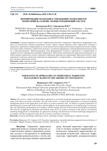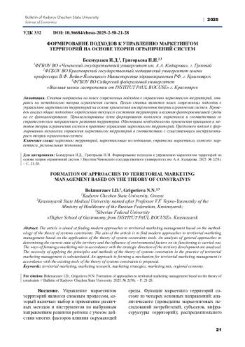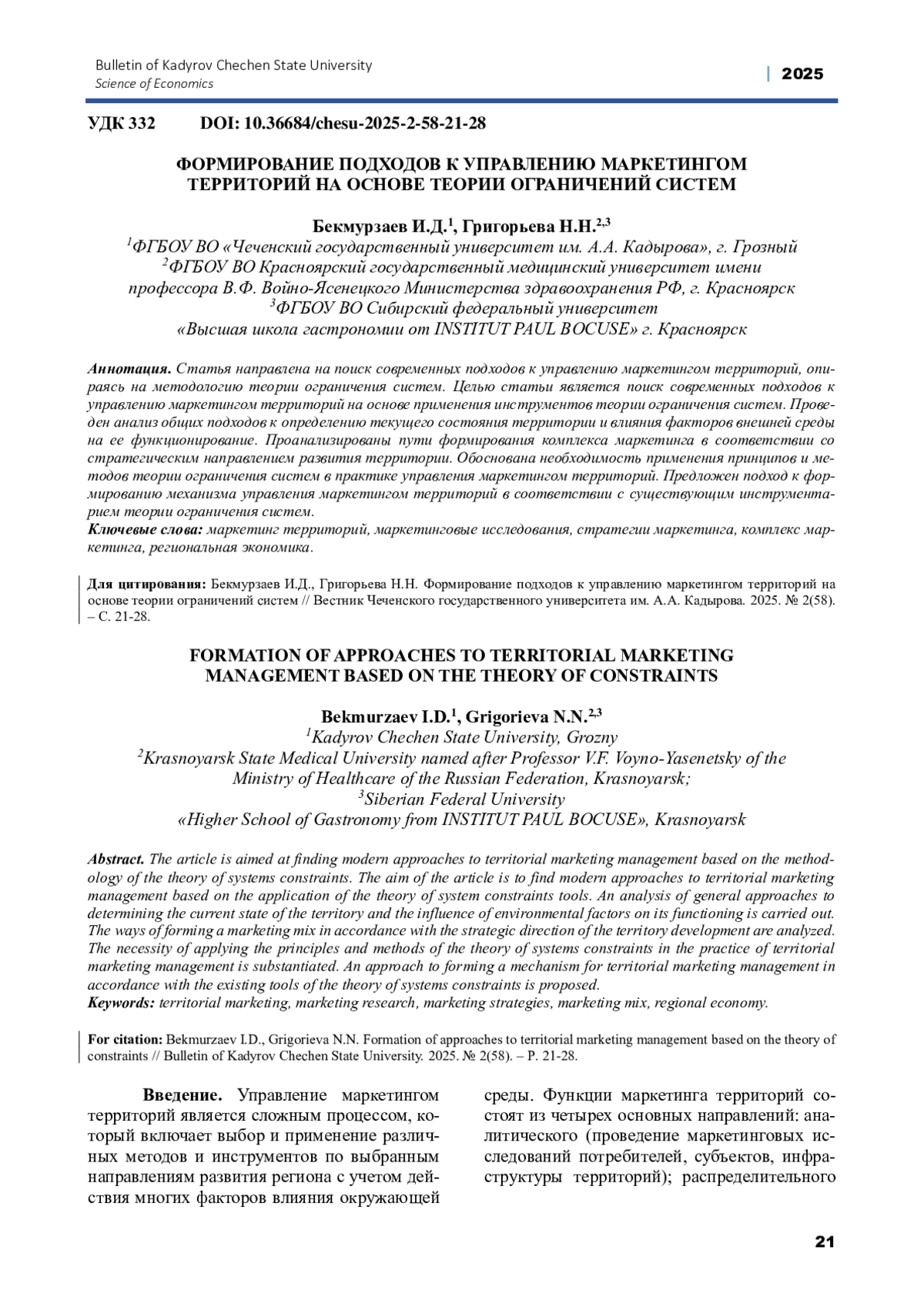 Статья направлена на поиск современных подходов к управлению маркетингом территорий, опираясь на методологию теории ограничения систем. Целью статьи является поиск современных подходов к управлению маркетингом территорий на основе применения инструментов теории ограничения систем. Проведен анализ общих подходов к определению текущего состояния территории и влияния факторов внешней среды на ее функционирование. Проанализированы пути формирования комплекса маркетинга в соответствии со стратегическим направлением развития территории. Обоснована необходимость применения принципов и методов теории ограничения систем в практике управления маркетингом территорий. Предложен подход к формированию механизма управления маркетингом территорий в соответствии с существующим инструментарием теории ограничения систем.
