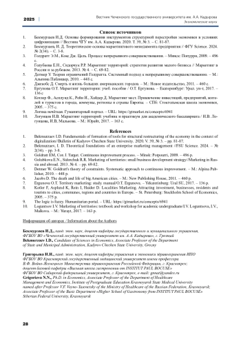7. Ергунова О.Т. Маркетинг территории: учеб. пособие / О.Т. Ергунова. - Екатеринбург: Урал. ун-т, 2017. - 136 с. EDN: ZVIXBB