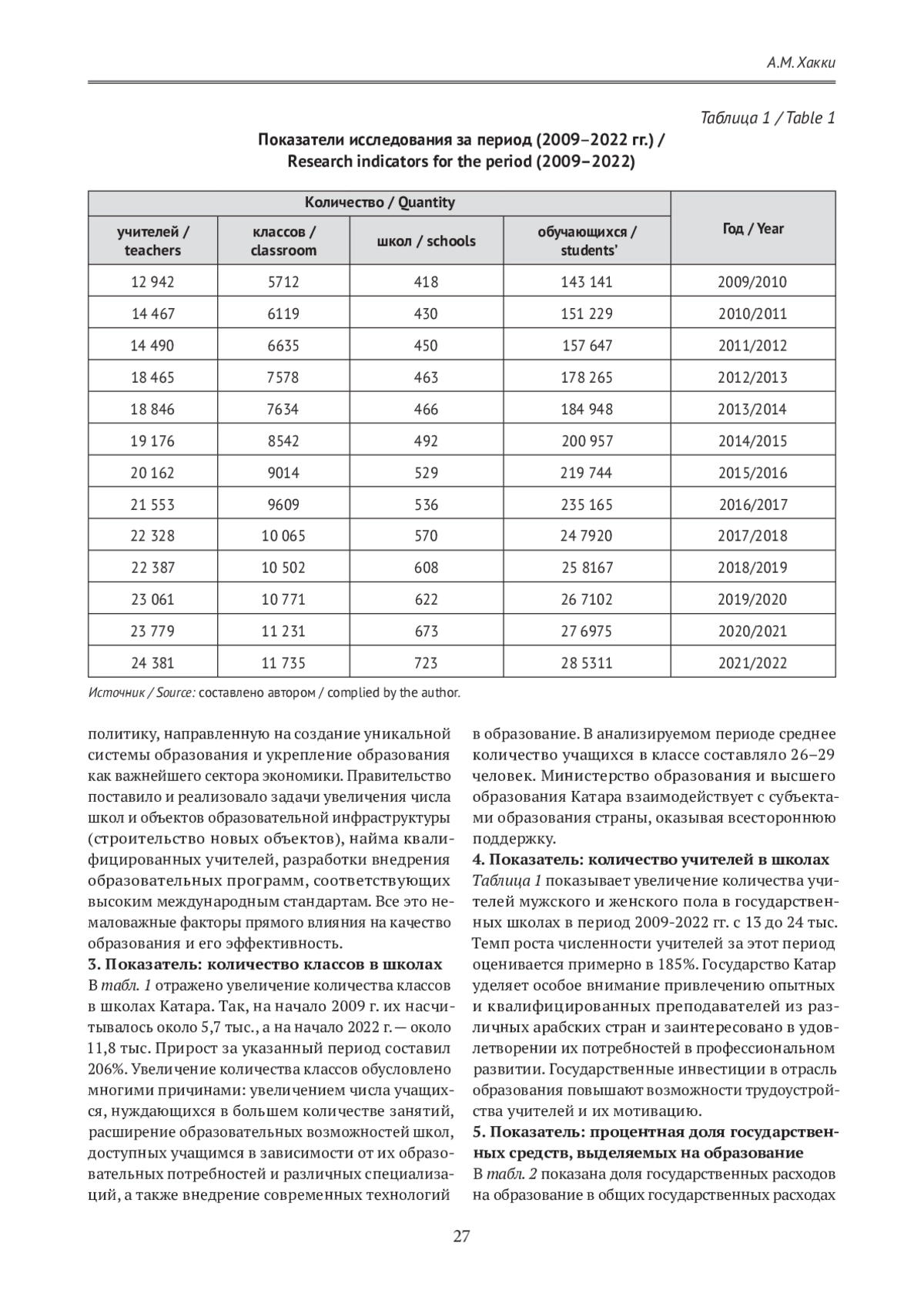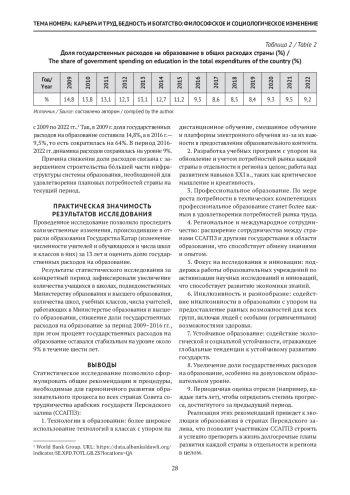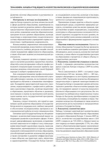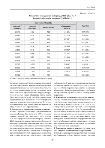 В настоящей статье использовалась статистика исследования по ряду факторов для определения реальности довузовского образования в Государстве Катар и пути развития образования в стране в обозримом будущем. Данные, полученные в ходе исследования, анализировались с использованием описательного и статистического подходов. Оценивались пять наиболее важных параметров — количество учителей, работающих во всех школах, число школ, классов и учащихся, объем государственных расходов на образование в процентах от валового национального дохода страны. Результаты исследования показали следующее: с 2009 по 2022 г. количество учащихся в школах, количество школ и классов, учителей, работающих в школах, увеличилось, в то время как доля расходов на образование в общем объеме государственных доходов снизилась с 2009 по 2015 г. В период с 2016 по 2022 г. доля расходов на образование в общих государственных доходах оставалась относительно постоянной (на уровне 9%). Данное исследование показало необходимость активизации усилий по интеграции передовых современных технологий в образовательный процесс во всех государственных довузовских образовательных учреждениях Государства Катар.