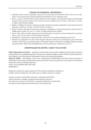 2. Hira A., Logan C. The development of the education system in Qatar: Assessing the intended and unintended impacts of privatization policy shifts. British Journal of Middle Eastern Studies. 2023;4(2):1-22. https://doi.org/10.1080/13530194.2023.2198688