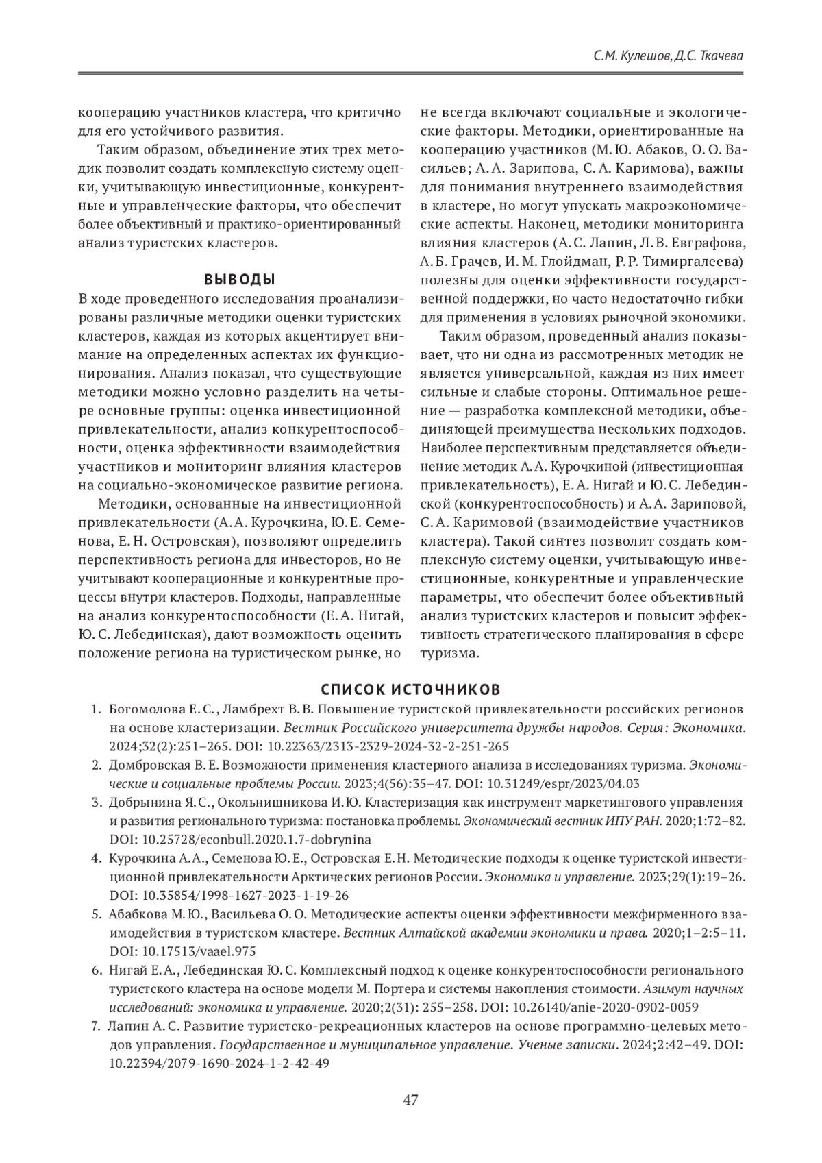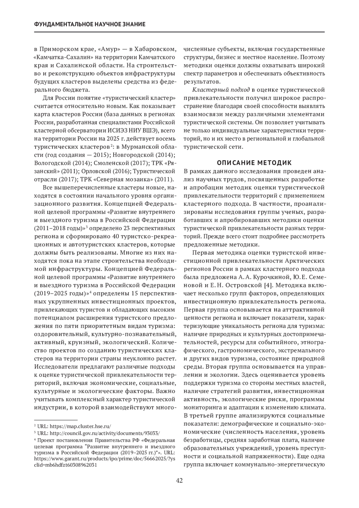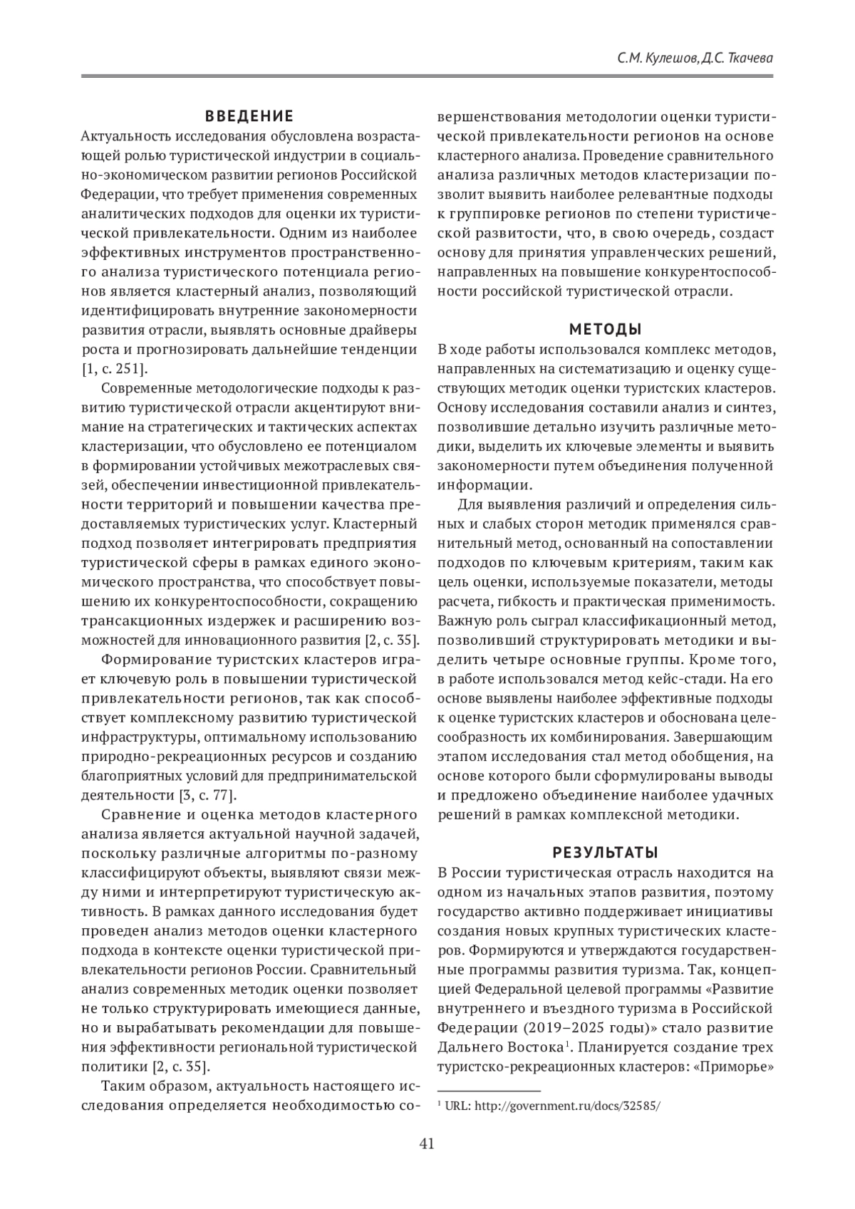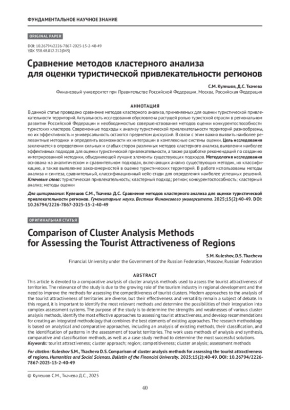 В данной статье проведено сравнение методов кластерного анализа, применяемых для оценки туристической привлекательности территорий. Актуальность исследования обусловлена растущей ролью туристской отрасли в региональном развитии Российской Федерации и необходимостью совершенствования методов оценки конкурентоспособности туристских кластеров. Современные подходы к анализу туристической привлекательности территорий разнообразны, но их эффективность и универсальность остаются предметом дискуссий. В связи с этим важно выявить наиболее релевантные методики и определить возможности их интеграции в комплексные системы оценки. Цель исследования заключается в определении сильных и слабых сторон различных методов кластерного анализа, выявлении наиболее эффективных подходов для оценки туристической привлекательности, а также разработке рекомендаций по созданию интегрированной методики, объединяющей лучшие элементы существующих подходов. Методология исследования основана на аналитическом и сравнительном подходах, включающих анализ существующих методик, их классификацию, а также выявление закономерностей в оценке туристических территорий. В работе использованы методы анализа и синтеза, сравнительный, классификационный кейс-стади для определения наиболее успешных решений.