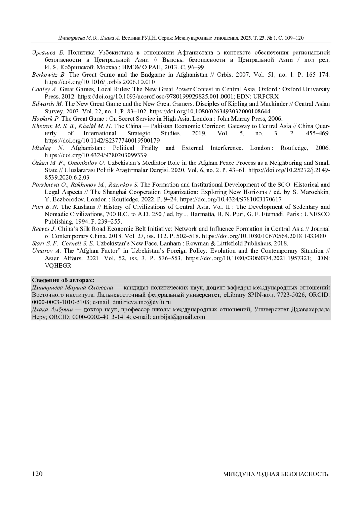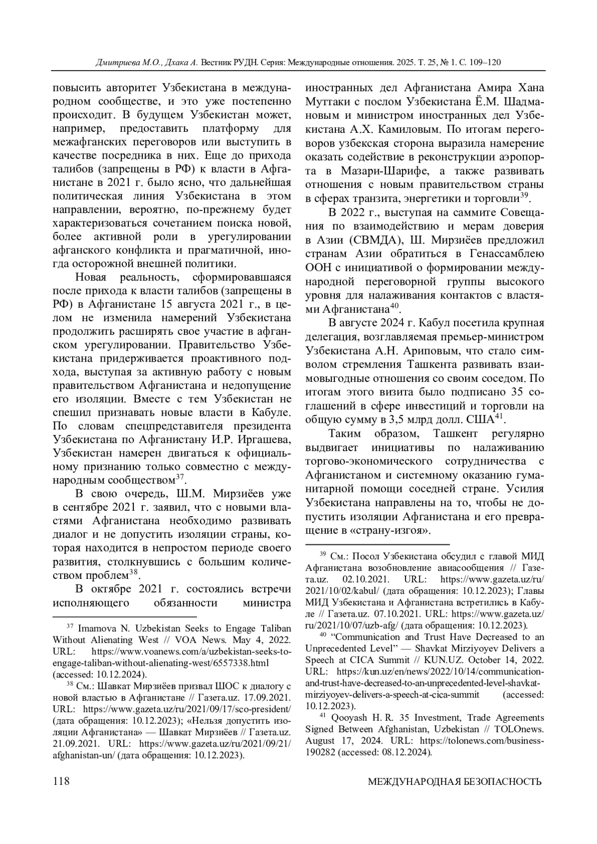 16. Umarov A. The “Afghan Factor” in Uzbekistan’s Foreign Policy: Evolution and the Contemporary Situation // Asian Affairs. 2021. Vol. 52, iss. 3. P. 536-553. ;. DOI: 10.1080/03068374.2021.1957321 EDN: VQHEGR