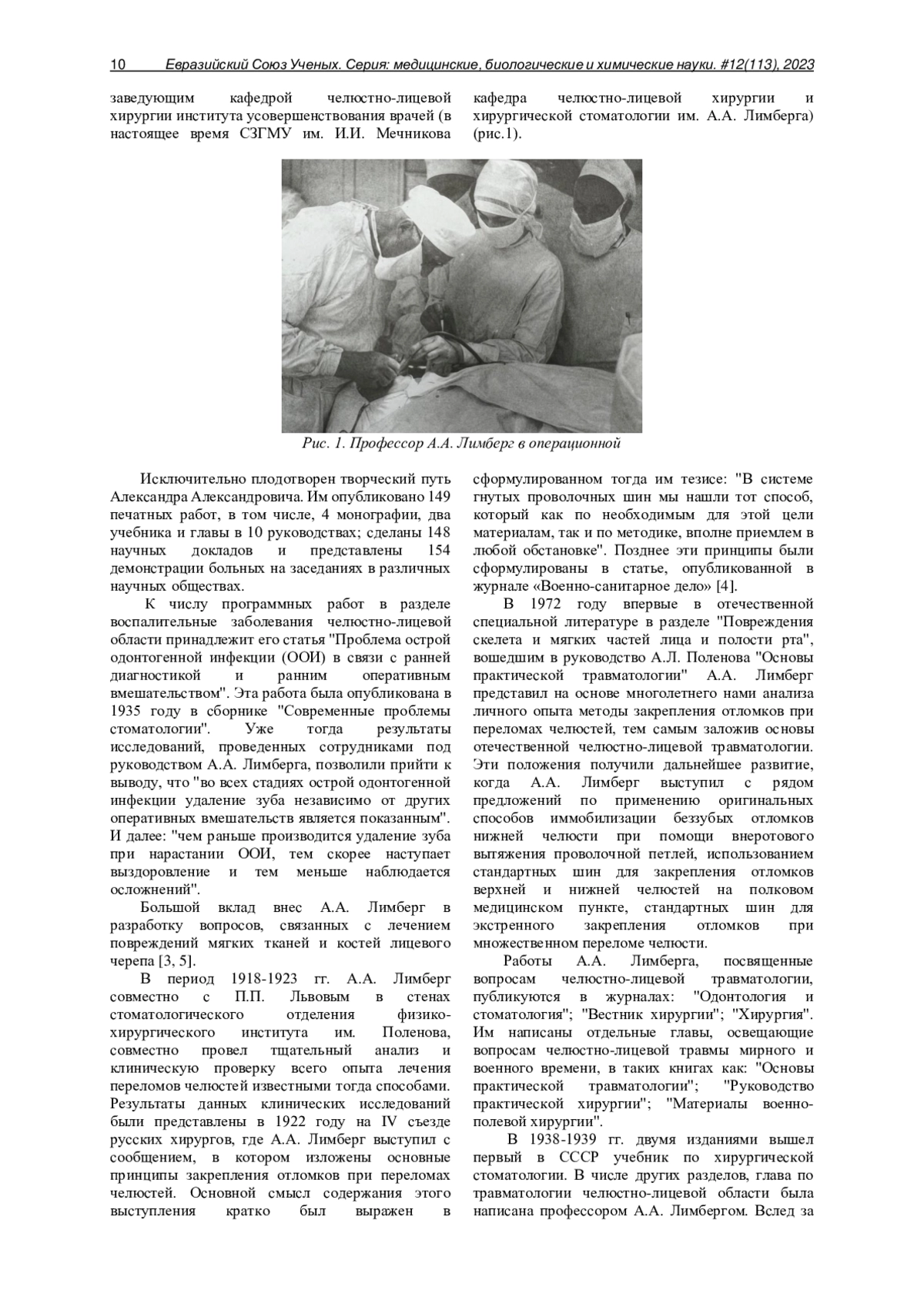 Имя выдающегося челюстно-лицевого хирурга, лауреата Государственной премии СССР, заслуженного деятеля науки РСФСР, членакорреспондента академии медицинских наук СССР, доктора медицинских наук профессора Александра Александровича Лимберга, создавшего научную школу челюстно-лицевых и пластических хирургов, хорошо известно медицинской общественности нашей страны и за рубежом [1, 2]. Александр Александрович родился в семье первого профессора стоматологии в России Александра Карловича и Елизаветы Альфредовны Лимберг 24 января (5 февраля) 1894 года в Петербурге [3].