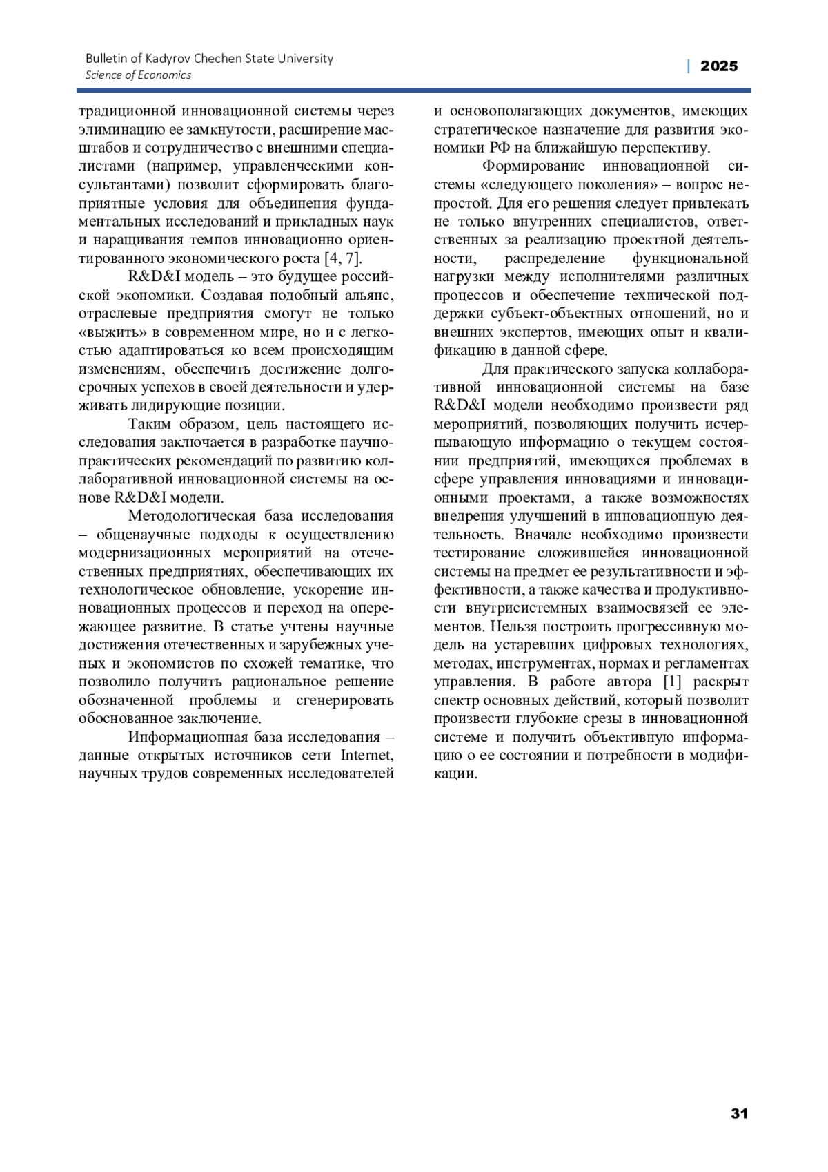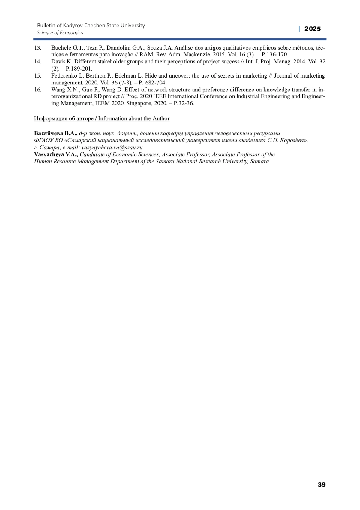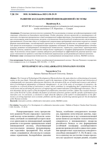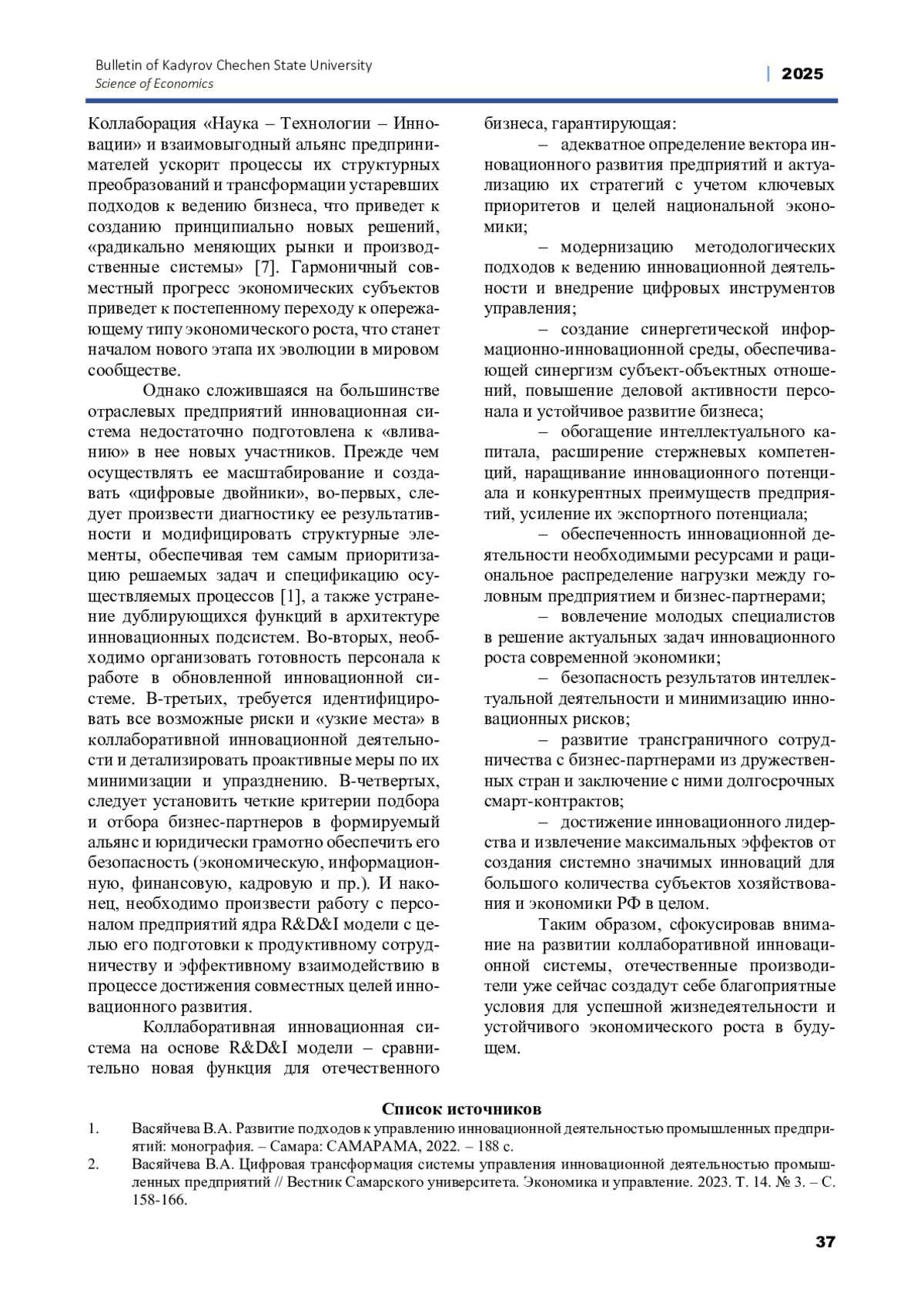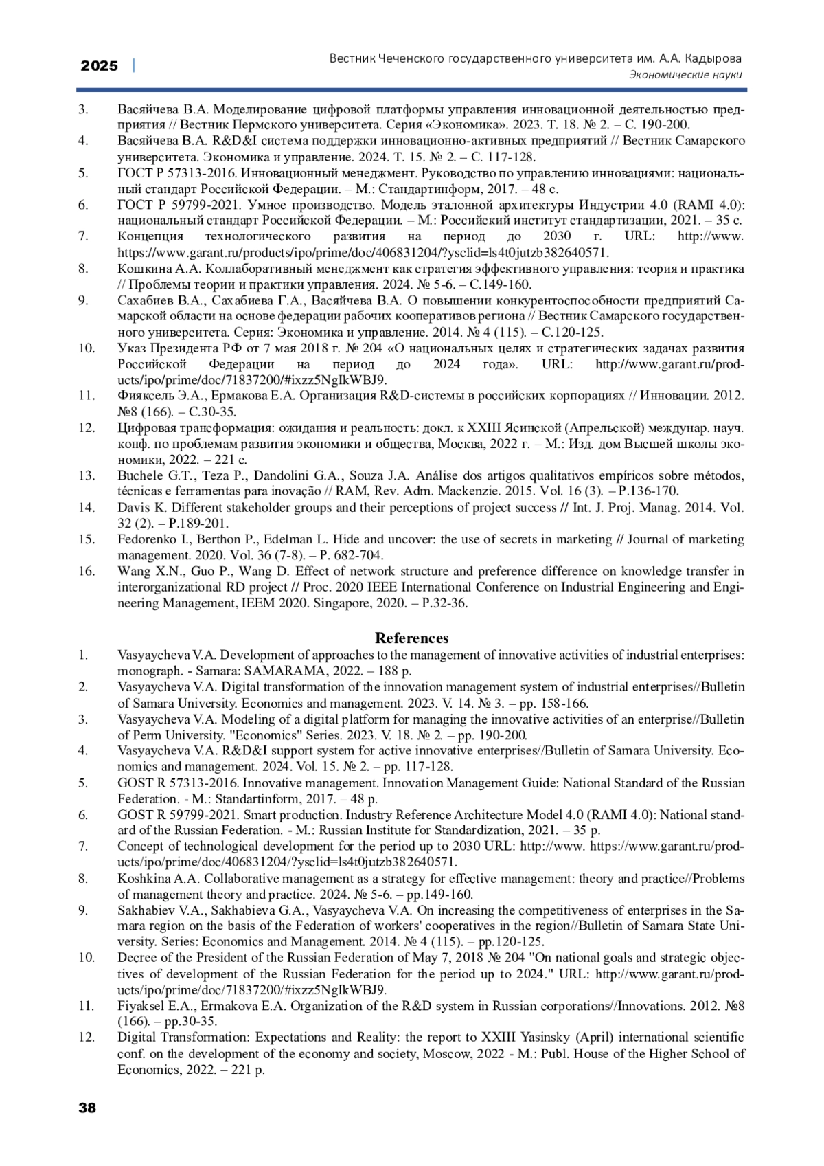 4. Васяйчева В.А. R&D&I система поддержки инновационно-активных предприятий // Вестник Самарского университета. Экономика и управление. 2024. Т. 15. № 2. - С. 117-128. EDN: XXKCHG