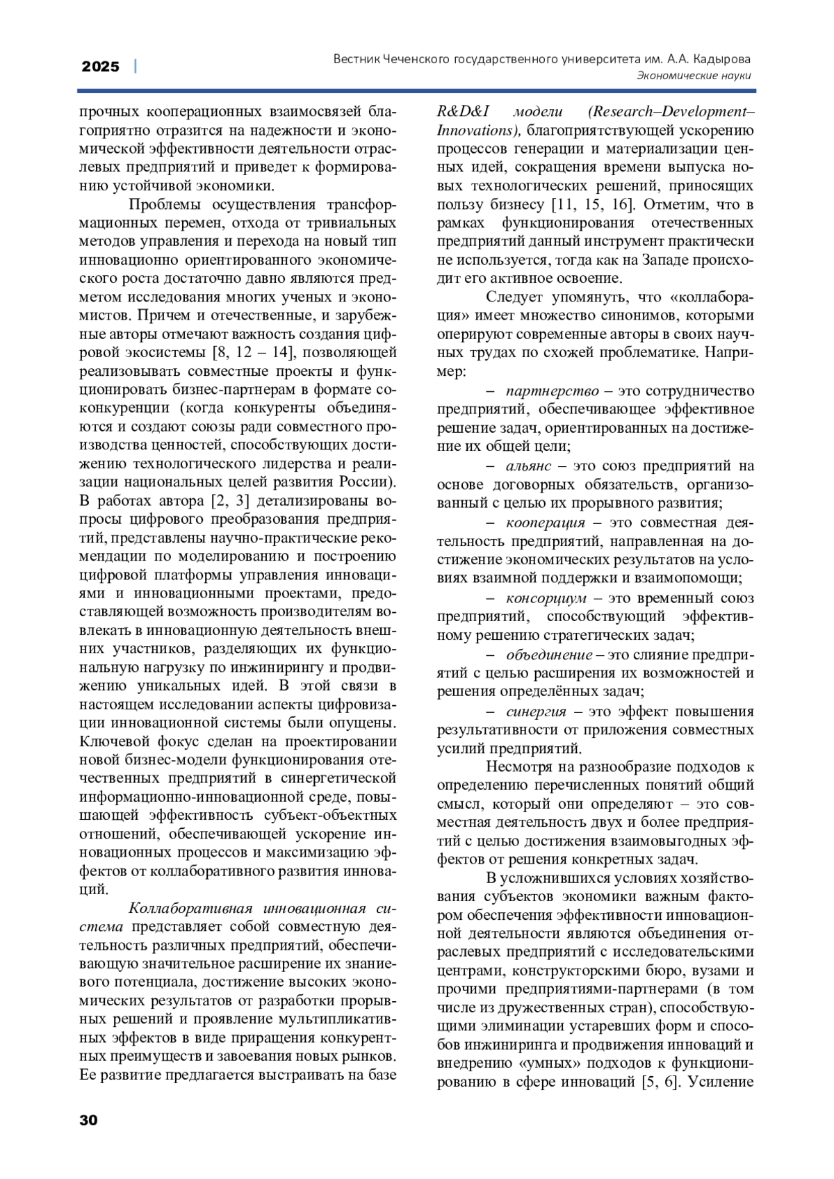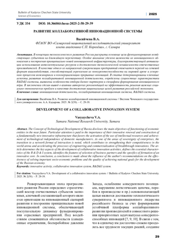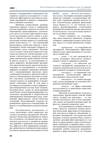 В концепции технологического развития России раскрыты основные цели функционирования хозяйствующих субъектов на ближайшую перспективу. Особое внимание уделено важности их инновационного обновления и построения принципиально новой инновационной инфраструктуры, благоприятствующей активизации использования интеллектуальных ресурсов и достижению технологической независимости отечественных производителей. В качестве одного из направлений суверенизации предприятий отмечается переход на сетевой формат взаимодействия, способствующий укреплению их конкурентоспособности на мировой арене и ускорению процессов инжиниринга и коммерциализации прорывных инноваций. В статье детерминированы ключевые аспекты развития коллаборативной инновационной деятельности, определены сущностные характеристики R&D&I-системы, выявлены особенности отбора бизнес-партнеров и специфика формирования инновационного ядра. В заключении сделан вывод о влиянии авторских рекомендаций на эффективность решения важных социально-экономических проблем и качество достижения национальных целей развития российской экономики.