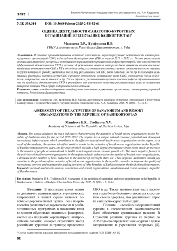 В статье проанализированы основные показатели, характеризующие деятельность санаторно-курортных организаций (СКО) в Республике Башкортостан (РБ) за период 2018 - 2022 гг. Регион располагает уникальным природно-ресурсным потенциалом и развитой рекреационной инфраструктурой, что способствует эффективной деятельности СКО в регионе. В результате анализа авторами были выявлены положительные тенденции деятельности СКО в РБ в последние годы, к ключевым из которых можно отнести высокую степень загрузки номерного фонда; увеличение числа лиц, размещенных в СКО; рост доходов СКО и др. К основным негативным факторам деятельности СКО в регионе относятся: сокращение числа СКО, уменьшение числа койко-мест; сокращение числа ночевок и др. Таким образом, региональным органам власти следует обратить внимание на проблемы деятельности СКО в республике для улучшения качества рекреационных услуг и сохранения лидерских позиций РБ в сфере оздоровительного отдыха.