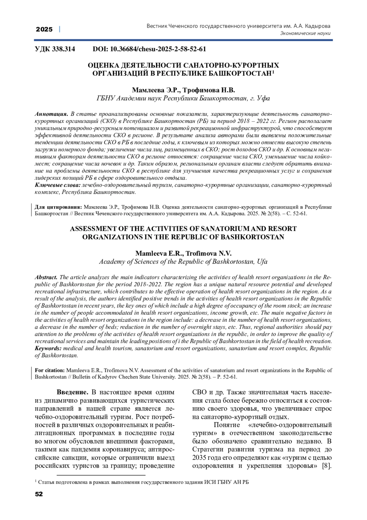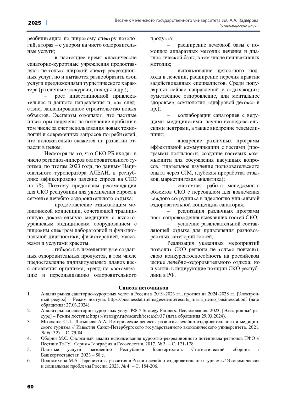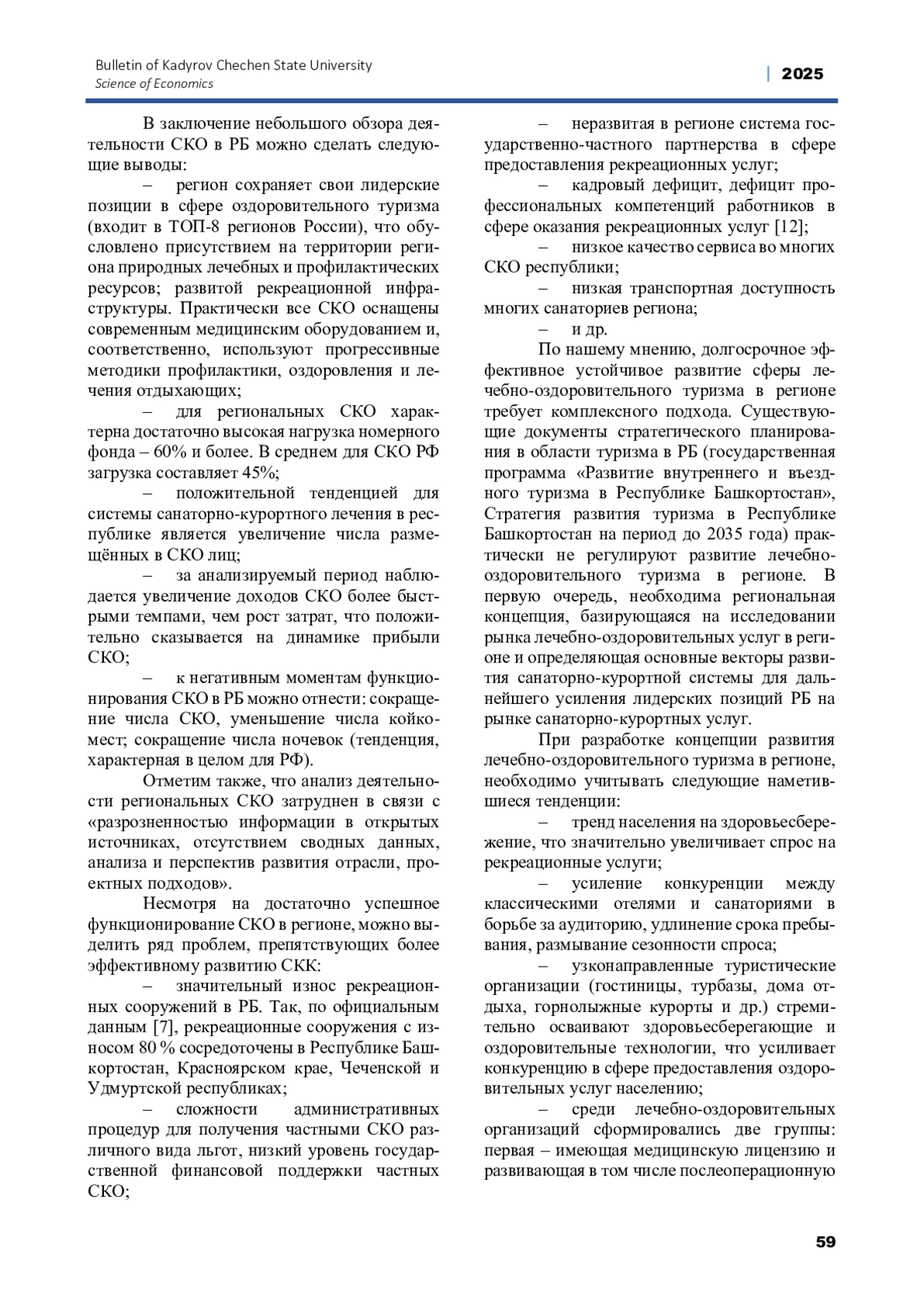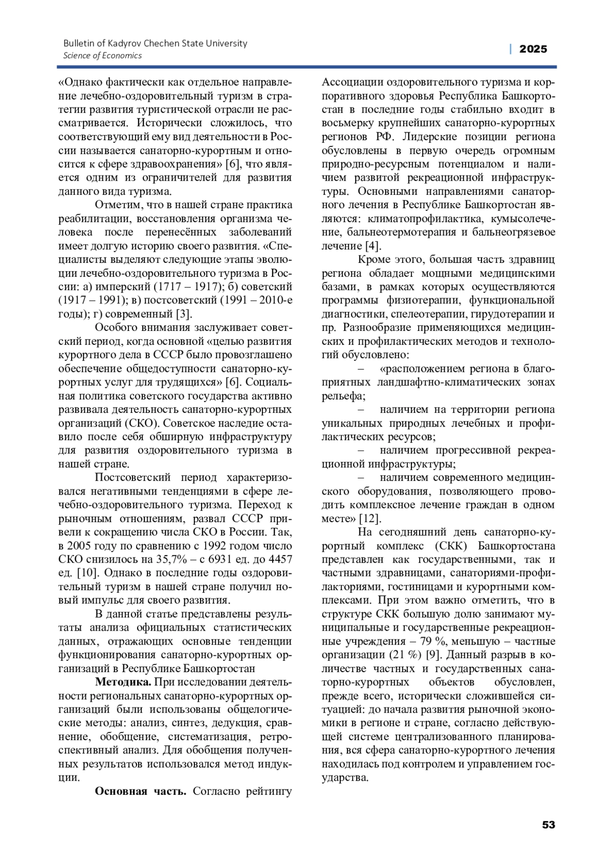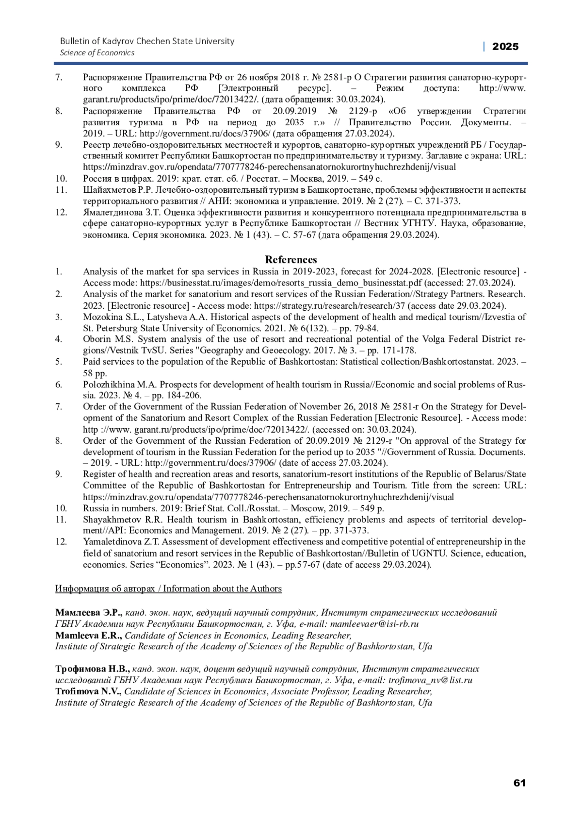 13. Ямалетдинова З.Т. Оценка эффективности развития и конкурентного потенциала предпринимательства в сфере санаторно-курортных услуг в Республике Башкортостан // Вестник УГНТУ. Наука, образование, экономика. Серия экономика. 2023. № 1 (43). - С. 57-67 (дата обращения 29.03.2024).