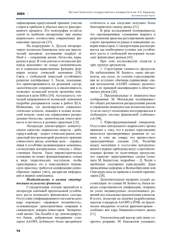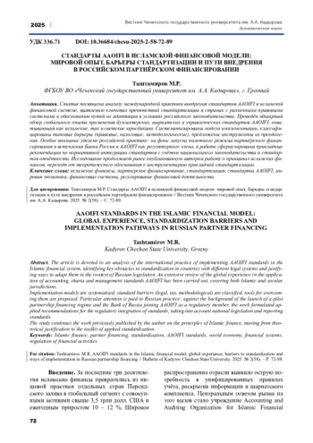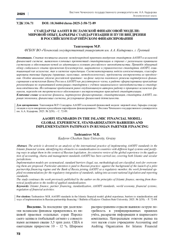 Аналогичную позицию занимают А. З. Нагимова [8] и А. Х. Умаров [16], которые акцентируют внимание на недостаточной прозрачности и нормативной неопределённости в сфере исламского финансирования в России. Они подчёркивают, что отсутствие стандартизированной отчётности, сопоставимой со стандартами AAOIFI, снижает доверие со стороны инвесторов из исламских стран, ориентированных на признанные формы шариатского комплаенса. Вопросы нормативного и институционального сопровождения исламского банкинга рассматриваются и в работе Н. А. Львовой, где подчёркивается необходимость законодательной проработки механизмов адаптации исламских инструментов к гражданскому и налоговому праву Российской Федерации [7]. Тем не менее, вопрос прямого применения стандартов AAOIFI в России вплоть до недавнего времени практически не поднимался в литературе.