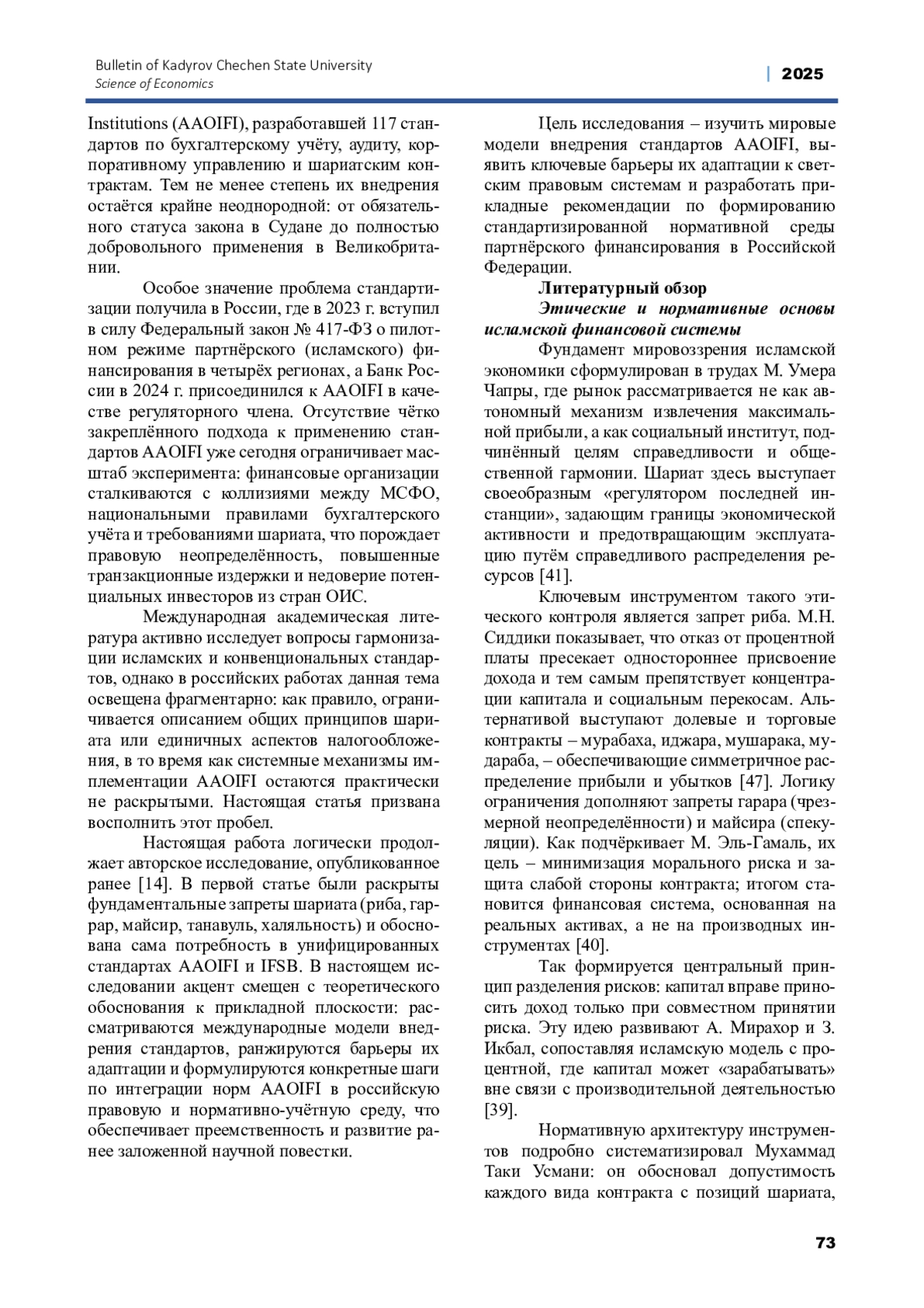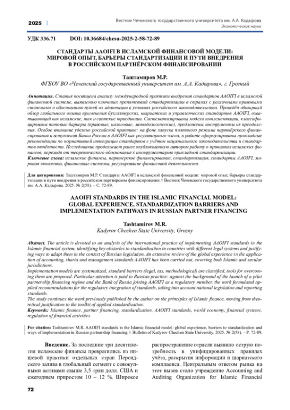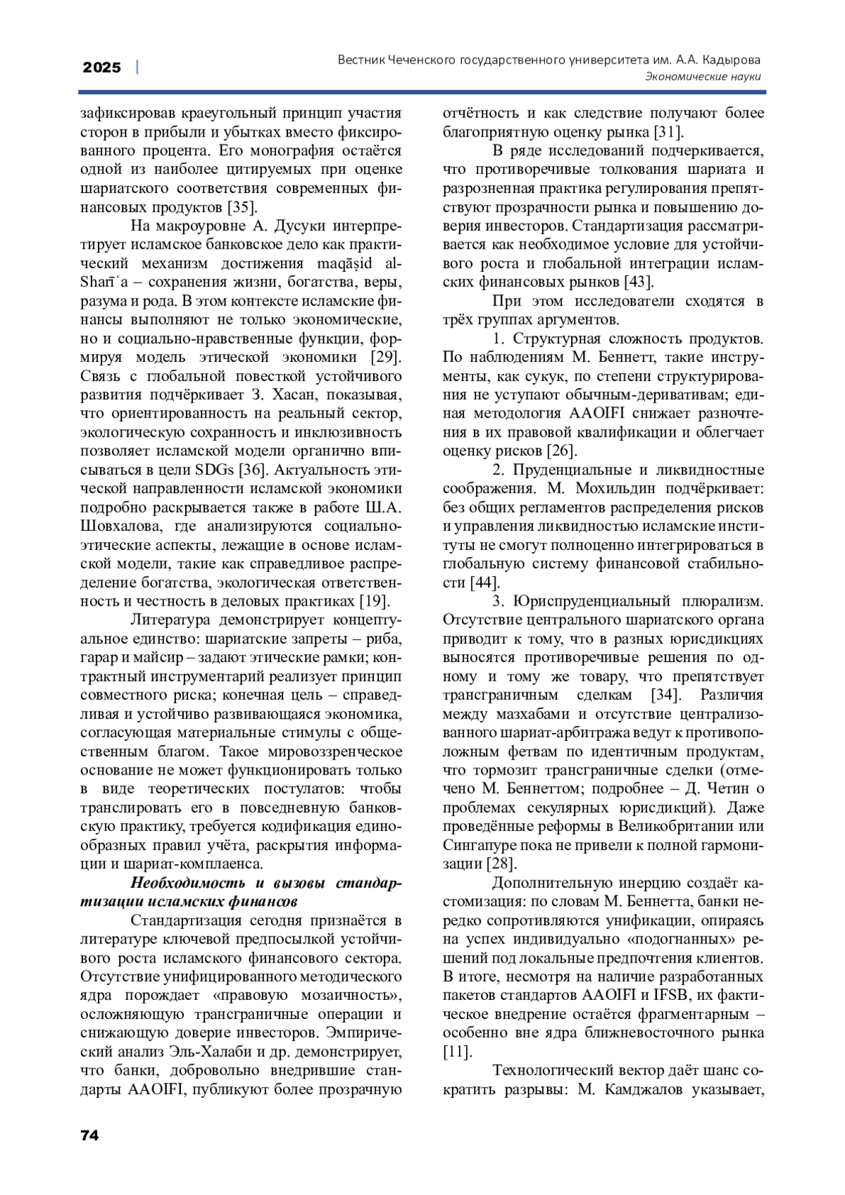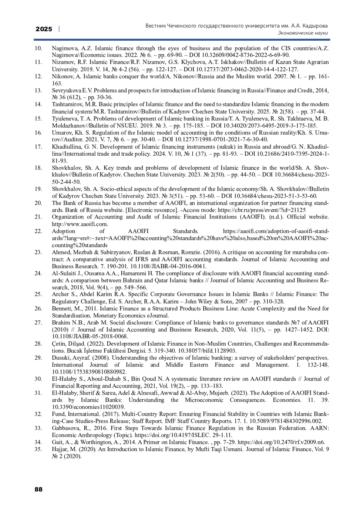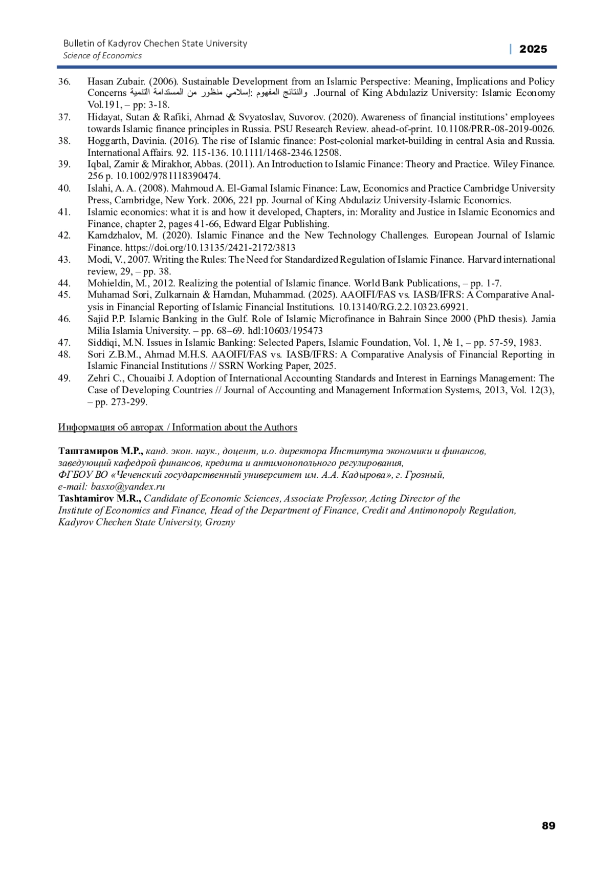 14. Таштамиров, М.Р. Базовые принципы исламских финансов и необходимость стандартизации исламского финансирования в современной финансовой системе / М.Р. Таштамиров // Вестник Чеченского государственного университета им. А.А. Кадырова. - 2025. - № 2(58). - С. 37-44. EDN: NYPYTD