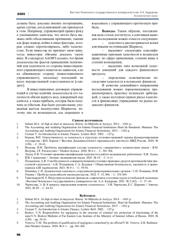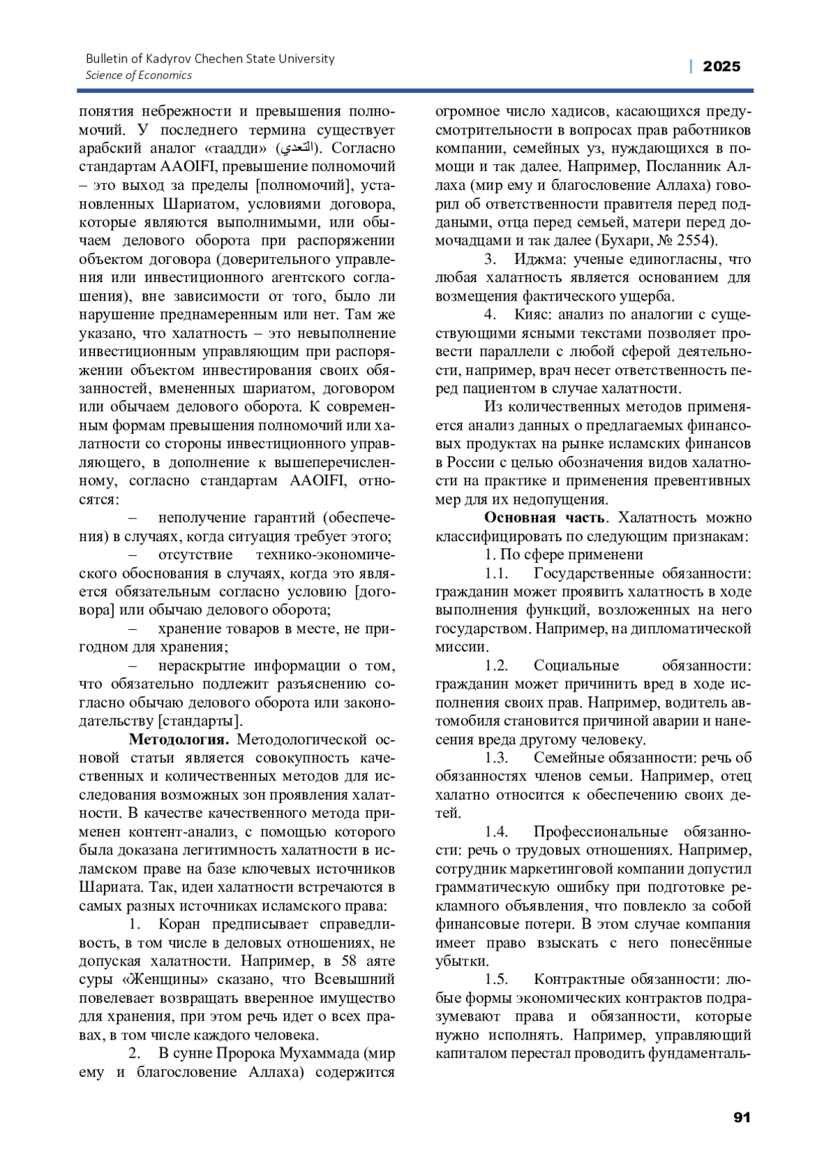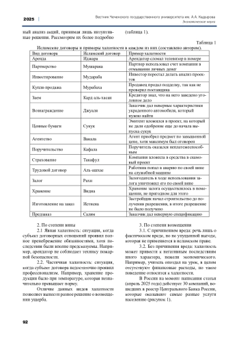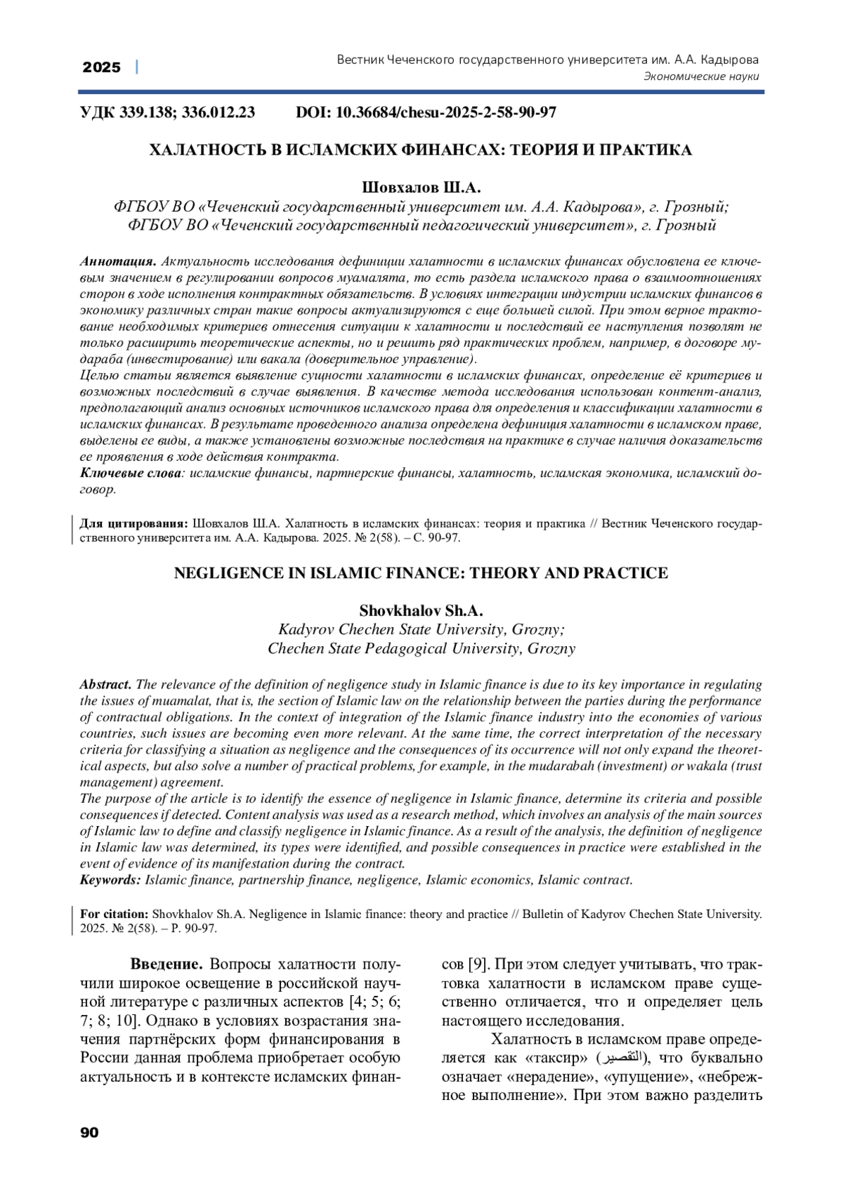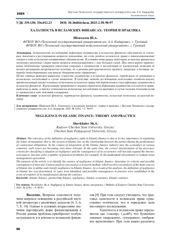 Актуальность исследования дефиниции халатности в исламских финансах обусловлена ее ключевым значением в регулировании вопросов муамалята, то есть раздела исламского права о взаимоотношениях сторон в ходе исполнения контрактных обязательств. В условиях интеграции индустрии исламских финансов в экономику различных стран такие вопросы актуализируются с еще большей силой. При этом верное трактование необходимых критериев отнесения ситуации к халатности и последствий ее наступления позволят не только расширить теоретические аспекты, но и решить ряд практических проблем, например, в договоре мудараба (инвестирование) или вакала (доверительное управление). Целью статьи является выявление сущности халатности в исламских финансах, определение её критериев и возможных последствий в случае выявления. В качестве метода исследования использован контент-анализ, предполагающий анализ основных источников исламского права для определения и классификации халатности в исламских финансах. В результате проведенного анализа определена дефиниция халатности в исламском праве, выделены ее виды, а также установлены возможные последствия на практике в случае наличия доказательств ее проявления в ходе действия контракта.