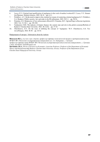 6. Лукки, Е.В. Уголовно-правовая квалификация халатности в работе медицинских работников / Е.В. Лукки, В.В. Странаткин // Эпомен: медицинские науки. 2025. № 18. - С. 6-11. EDN: UKNYOI