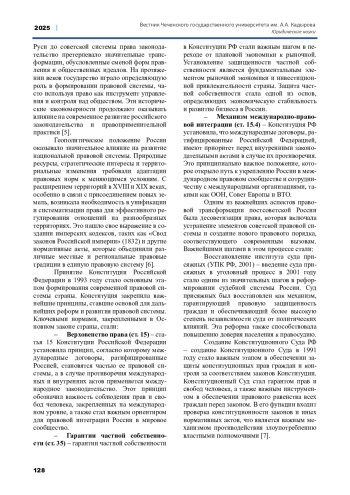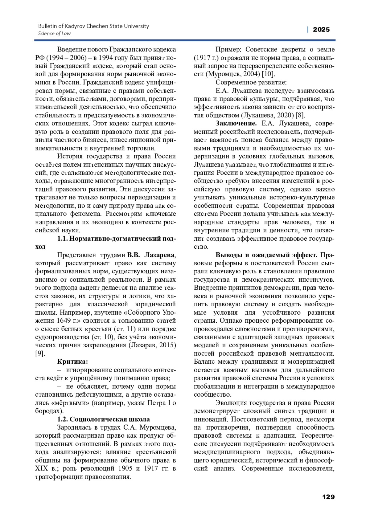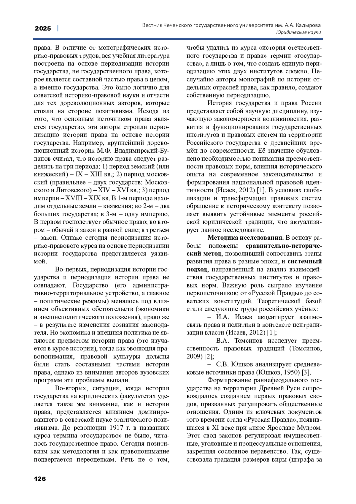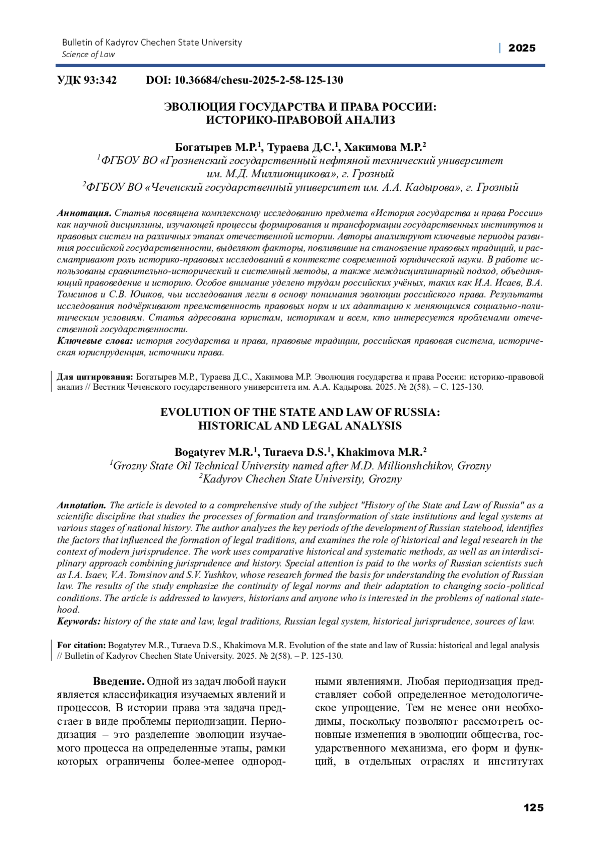 Статья посвящена комплексному исследованию предмета «История государства и права России» как научной дисциплины, изучающей процессы формирования и трансформации государственных институтов и правовых систем на различных этапах отечественной истории. Авторы анализируют ключевые периоды развития российской государственности, выделяют факторы, повлиявшие на становление правовых традиций, и рассматривают роль историко-правовых исследований в контексте современной юридической науки. В работе использованы сравнительно-исторический и системный методы, а также междисциплинарный подход, объединяющий правоведение и историю. Особое внимание уделено трудам российских учёных, таких как И. А. Исаев, В. А. Томсинов и С. В. Юшков, чьи исследования легли в основу понимания эволюции российского права. Результаты исследования подчёркивают преемственность правовых норм и их адаптацию к меняющимся социально-политическим условиям. Статья адресована юристам, историкам и всем, кто интересуется проблемами отечественной государственности.