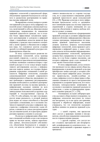 В эпоху стремительного развития информационных технологий, когда границы расстояний стираются, а доступ к информации становится практически неограниченным, особенно значимым становится вопрос о правовой культуре и это не только вопрос нормативного регулирования доступа к информации или защиты данных, но и вопрос формирования социальных отношений в новой реальности. Цифровые технологии, служащие коммуникационной основой современного информационного общества, предъявляют новые требования к правовому регулированию, вызывая необходимость активного реагирования правовой системы на вызовы времени, а цифровизация оказывает влияние на всех участников общественных отношений: от индивидуальных пользователей до крупных корпораций и государственных структур [9, с.156]. От себя добавим, что при этом формируется новая реальность, в которой важную роль играет не только способность к быстрой адаптации к изменениям, но и осознание значимости правовой культуры в цифровом пространстве, а цифровые технологии, таким образом, становятся не только инструментарием для достижения целей, но и фактором, формирующим правовое сознание и культуру.