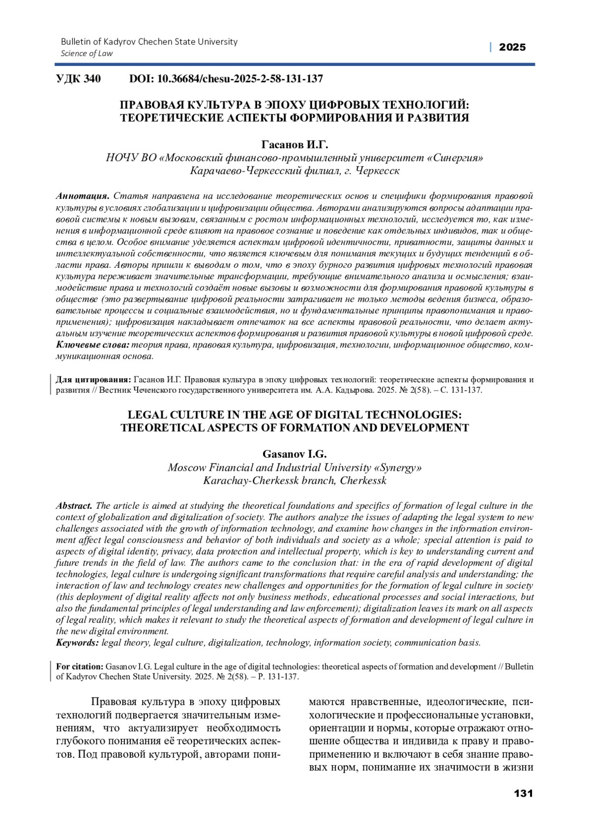 Статья направлена на исследование теоретических основ и специфики формирования правовой культуры в условиях глобализации и цифровизации общества. Авторами анализируются вопросы адаптации правовой системы к новым вызовам, связанным с ростом информационных технологий, исследуется то, как изменения в информационной среде влияют на правовое сознание и поведение как отдельных индивидов, так и общества в целом. Особое внимание уделяется аспектам цифровой идентичности, приватности, защиты данных и интеллектуальной собственности, что является ключевым для понимания текущих и будущих тенденций в области права. Авторы пришли к выводам о том, что в эпоху бурного развития цифровых технологий правовая культура переживает значительные трансформации, требующие внимательного анализа и осмысления; взаимодействие права и технологий создаёт новые вызовы и возможности для формирования правовой культуры в обществе (это развертывание цифровой реальности затрагивает не только методы ведения бизнеса, образовательные процессы и социальные взаимодействия, но и фундаментальные принципы правопонимания и правоприменения); цифровизация накладывает отпечаток на все аспекты правовой реальности, что делает актуальным изучение теоретических аспектов формирования и развития правовой культуры в новой цифровой среде.