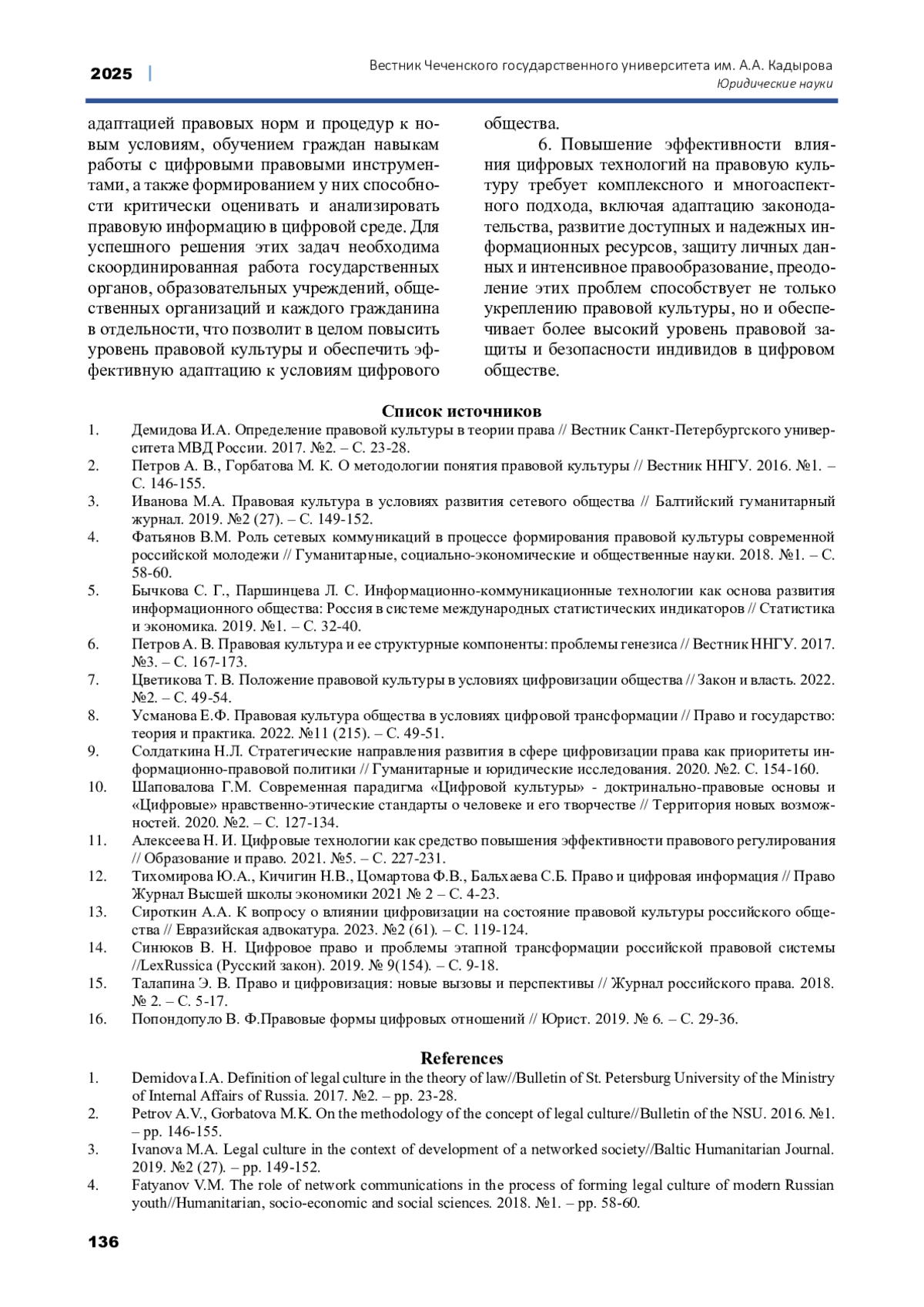 3. Иванова М.А. Правовая культура в условиях развития сетевого общества // Балтийский гуманитарный журнал. 2019. №2 (27). - С. 149-152. EDN: LIPHOB