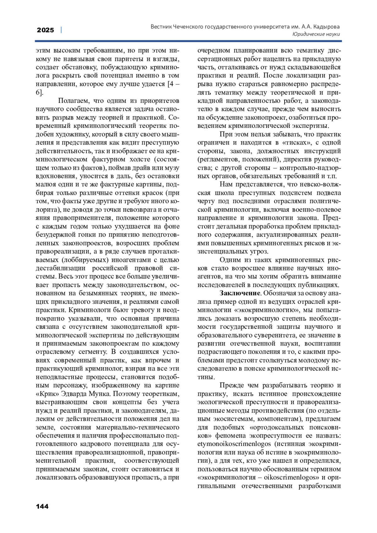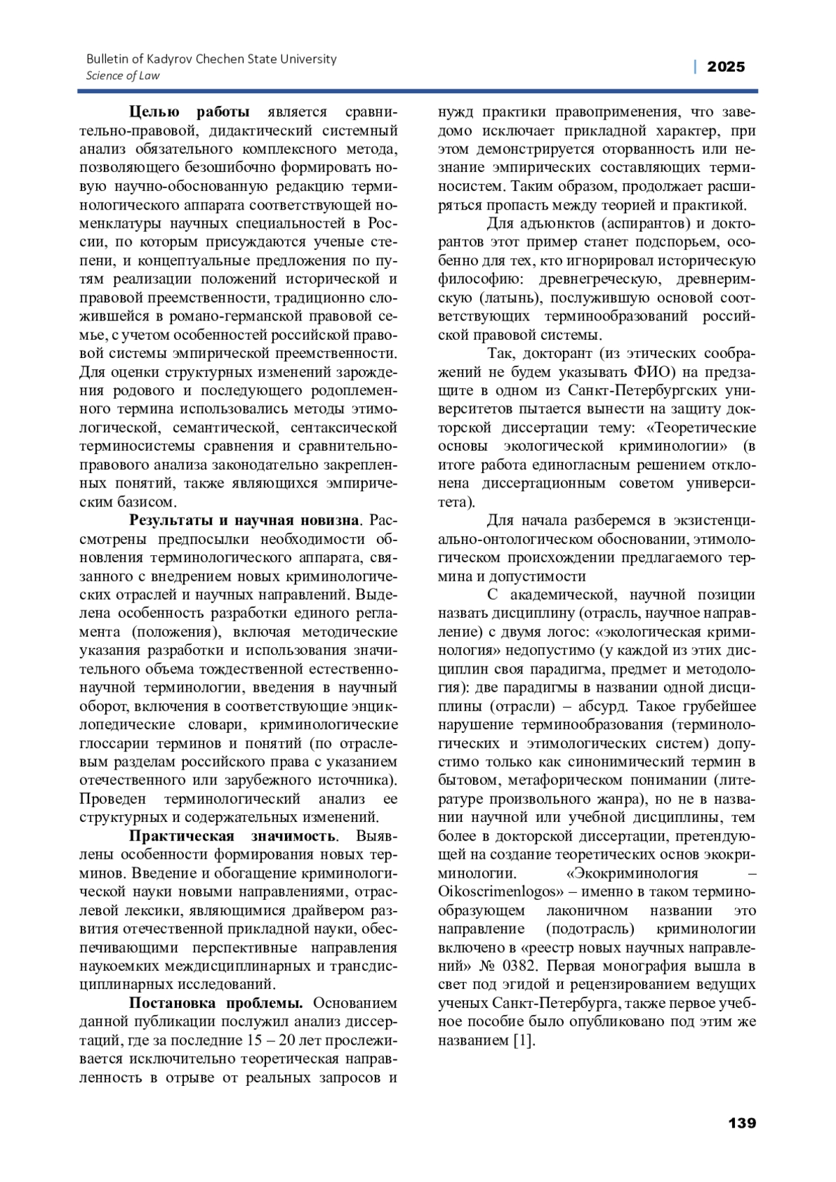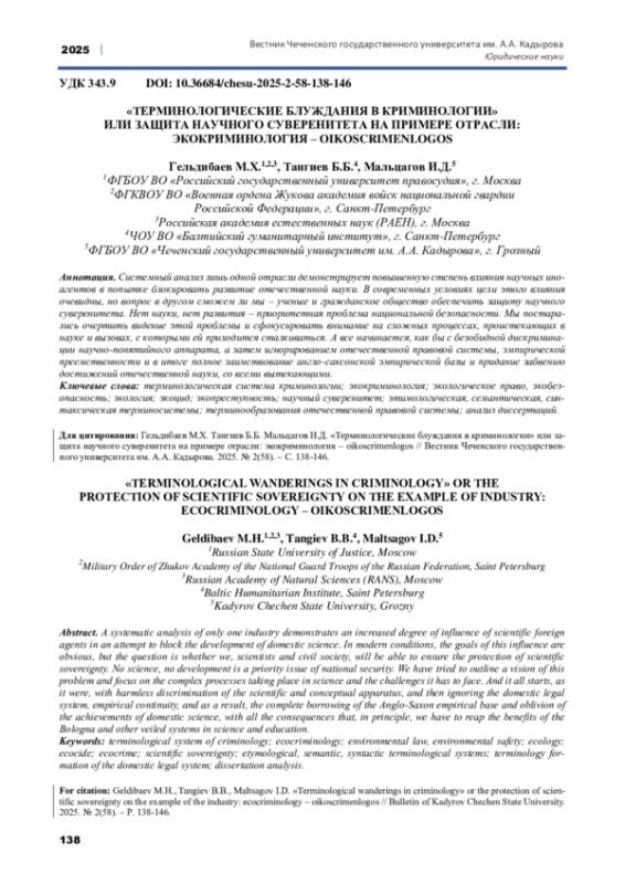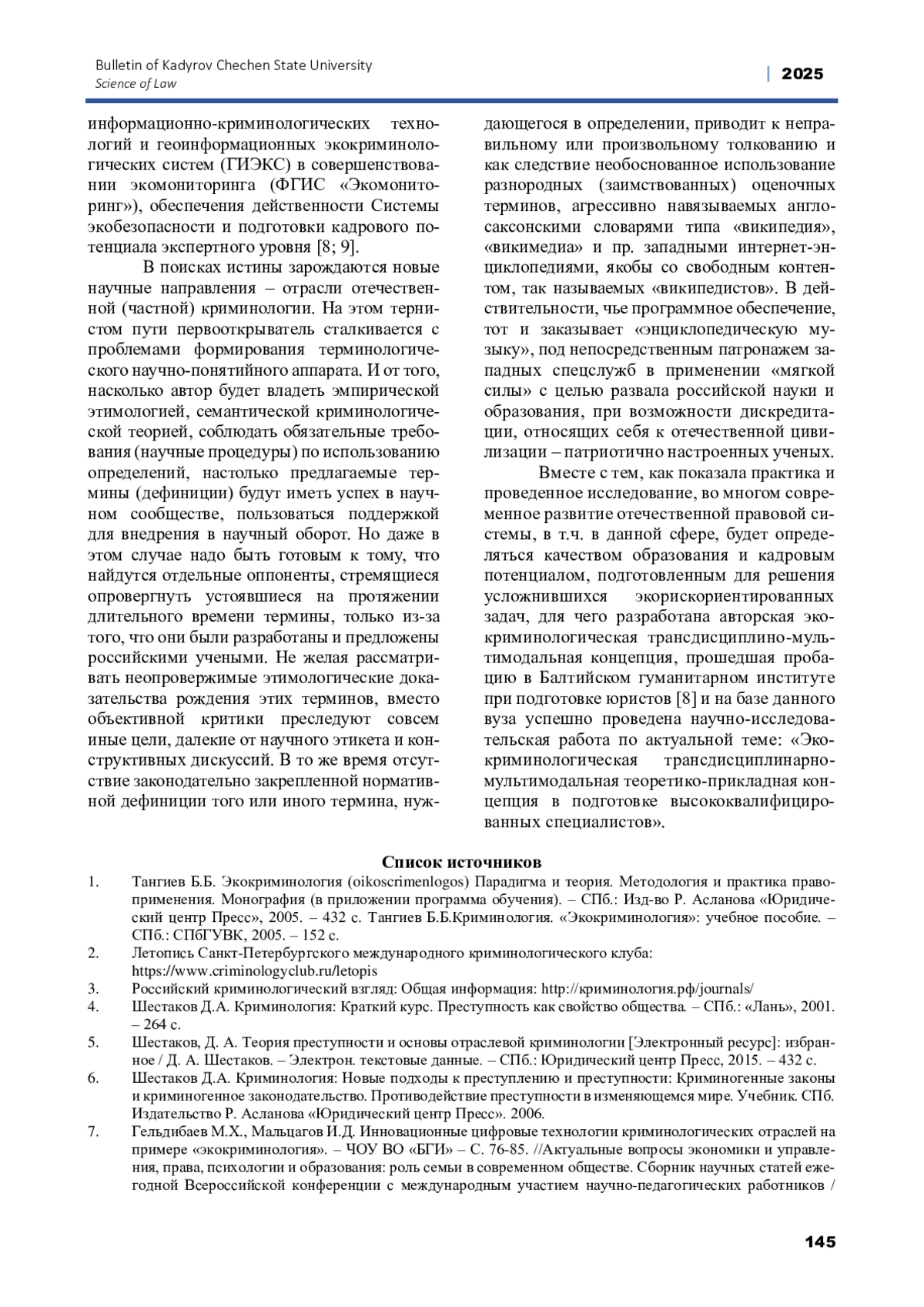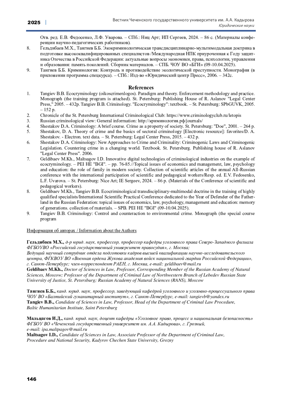 8. Гельдибаев М.Х., Тангиев Б.Б. Экокриминологическая трансдисциплинарно-мультимодальная доктрина в подготовке высококвалифицированных специалистов /Международная НПК приуроченная к Году защитника Отечества в Российской Федерации: актуальные вопросы экономики, права, психологии, управления и образования: память поколений. Сборник материалов. - СПб. ЧОУ ВО “БГИ” (09-10.04.2025).