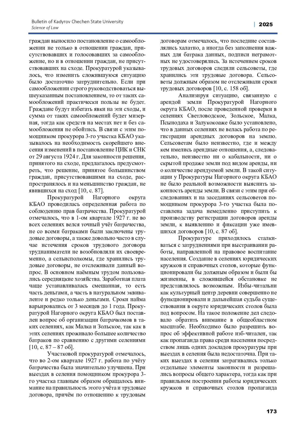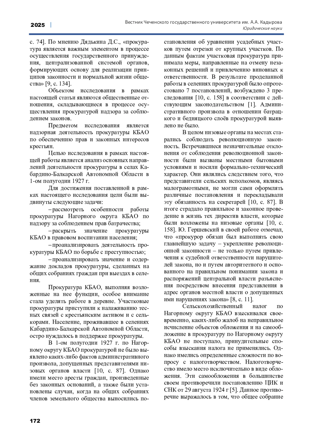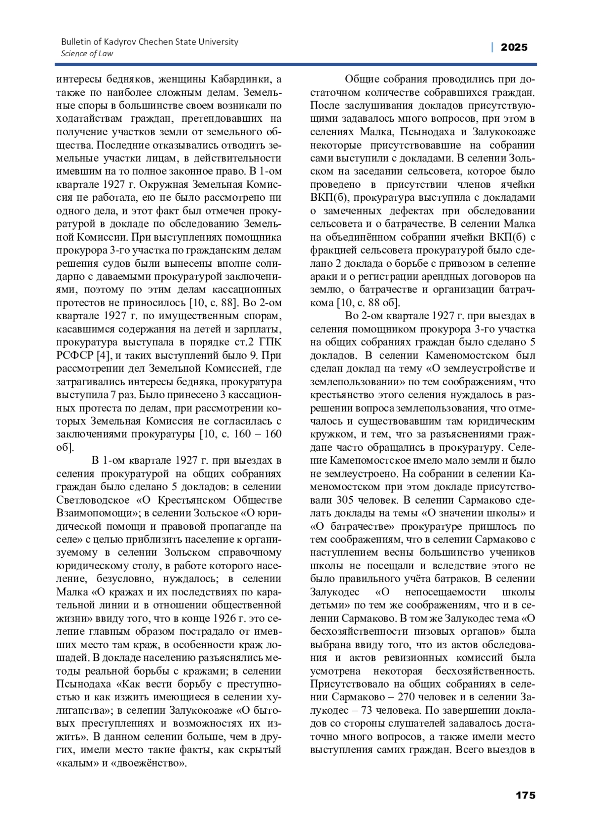 МИРЗОЕВ З.Т. ОСНОВНЫЕ ПОКАЗАТЕЛИ РАБОТЫ В ДЕРЕВНЕ ПРОКУРАТУРЫ НАГОРНОГО ОКРУГА КАБАРДИНО-БАЛКАРСКОЙ АВТОНОМНОЙ ОБЛАСТИ В 1927 ГОДУ // ВЕСТНИК ЧЕЧЕНСКОГО ГОСУДАРСТВЕННОГО УНИВЕРСИТЕТА ИМ. А. А. КАДЫРОВА. 2025. № 2 (58)